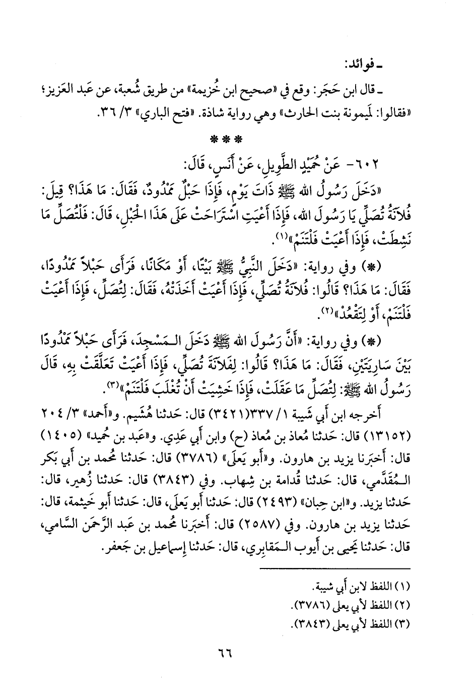 - وفي رواية: «أن رسول الله صَلى الله عَليه وسَلم دخل المسجد، فرأى حبلا ممدودا بين ساريتين، فقال: ما هذا؟ قالوا: لفلانة تصلي، فإذا أعيت تعلقت به، قال رسول الله صَلى الله عَليه وسَلم: لتصل ما عقلت، فإذا خشيت أن تغلب فلتنم» (¬٣).