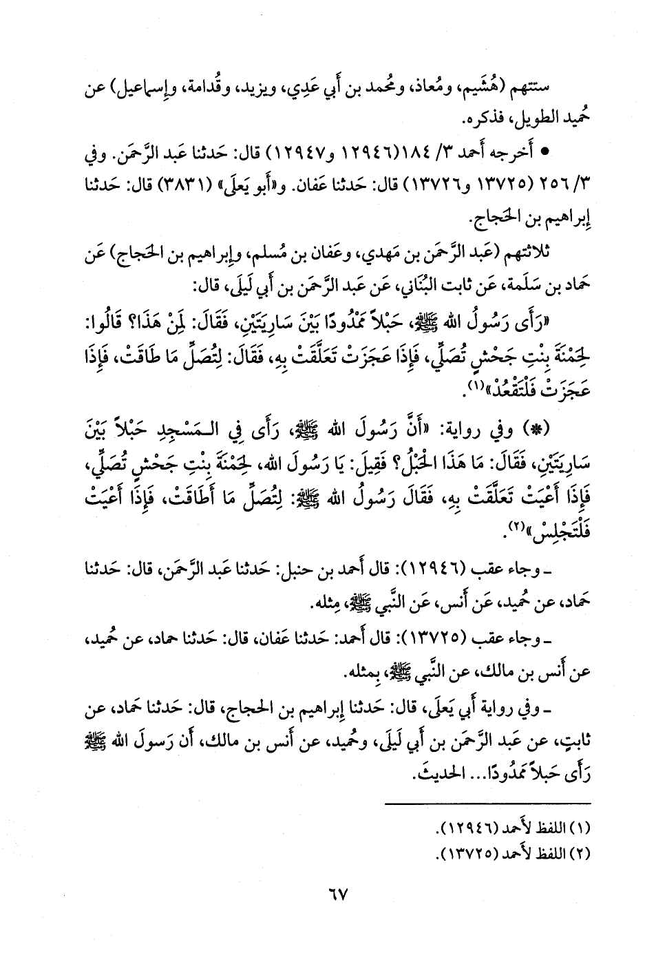 - وجاء عقب (١٢٩٤٦): قال أحمد بن حنبل: حدثنا عبد الرَّحمَن، قال: حدثنا حماد، عن حميد، عن أَنس، عن النبي صَلى الله عَليه وسَلم، مِثلَه.