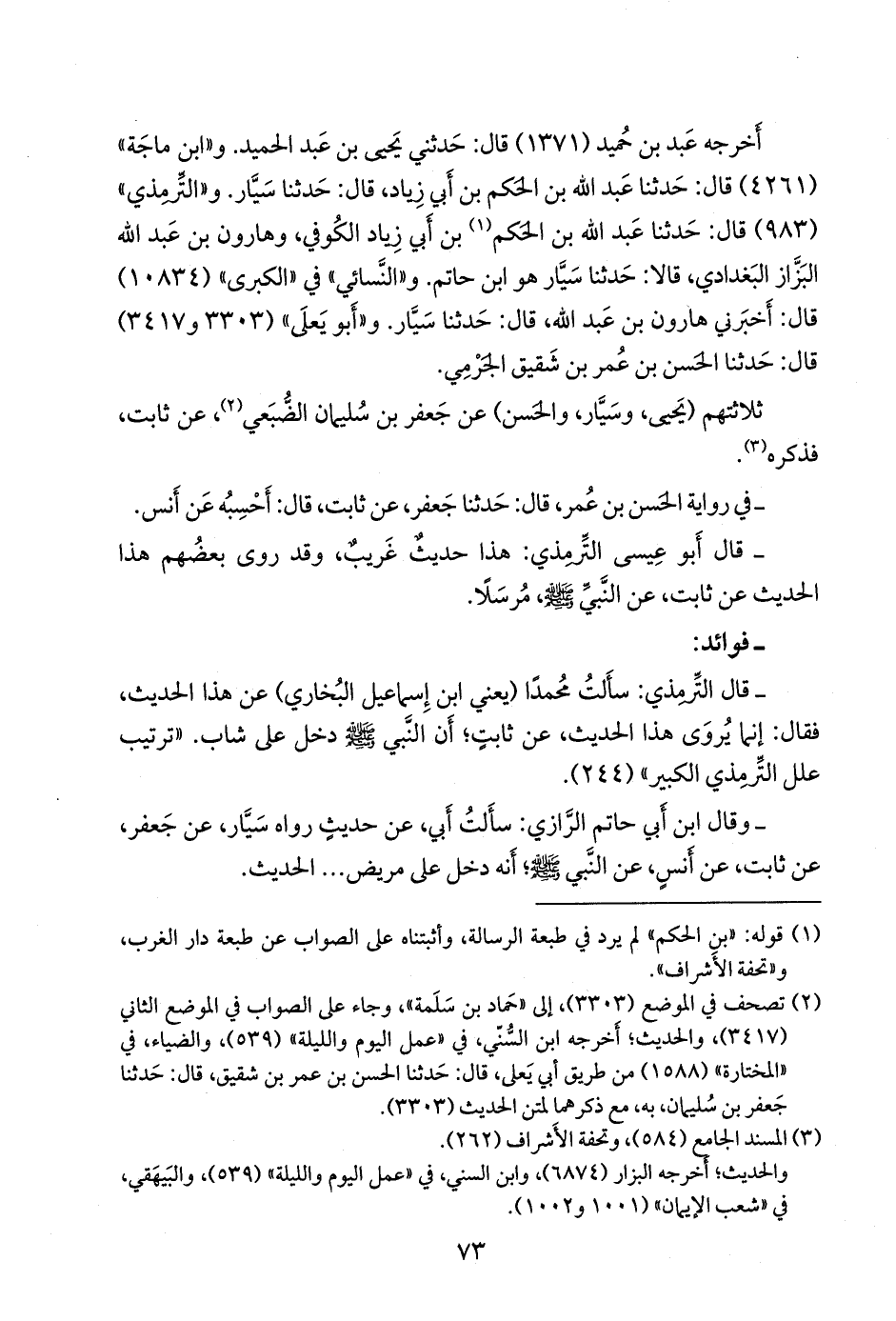 - وقال ابن أَبي حاتم الرازي: سأَلتُ أَبي، عن حديث رواه سَيَّار، عن جعفر، عن ثابت، عن أَنس، عن النبي صَلى الله عَليه وسَلم؛ أَنه دخل على مريض، الحديث.