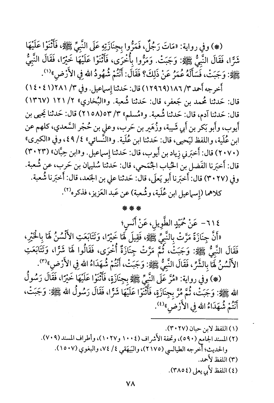 - وفي رواية: «مات رجل، فمروا بجنازته على النبي صَلى الله عَليه وسَلم فأثنوا عليها شرا، فقال النبي صَلى الله عَليه وسَلم: وجبت. ومروا بأخرى، فأثنوا عليها خيرا، فقال النبي صَلى الله عَليه وسَلم: وجبت، فسأله عمر عن ذلك؟ فقال: أنتم شهود الله في الأرض» (¬١).