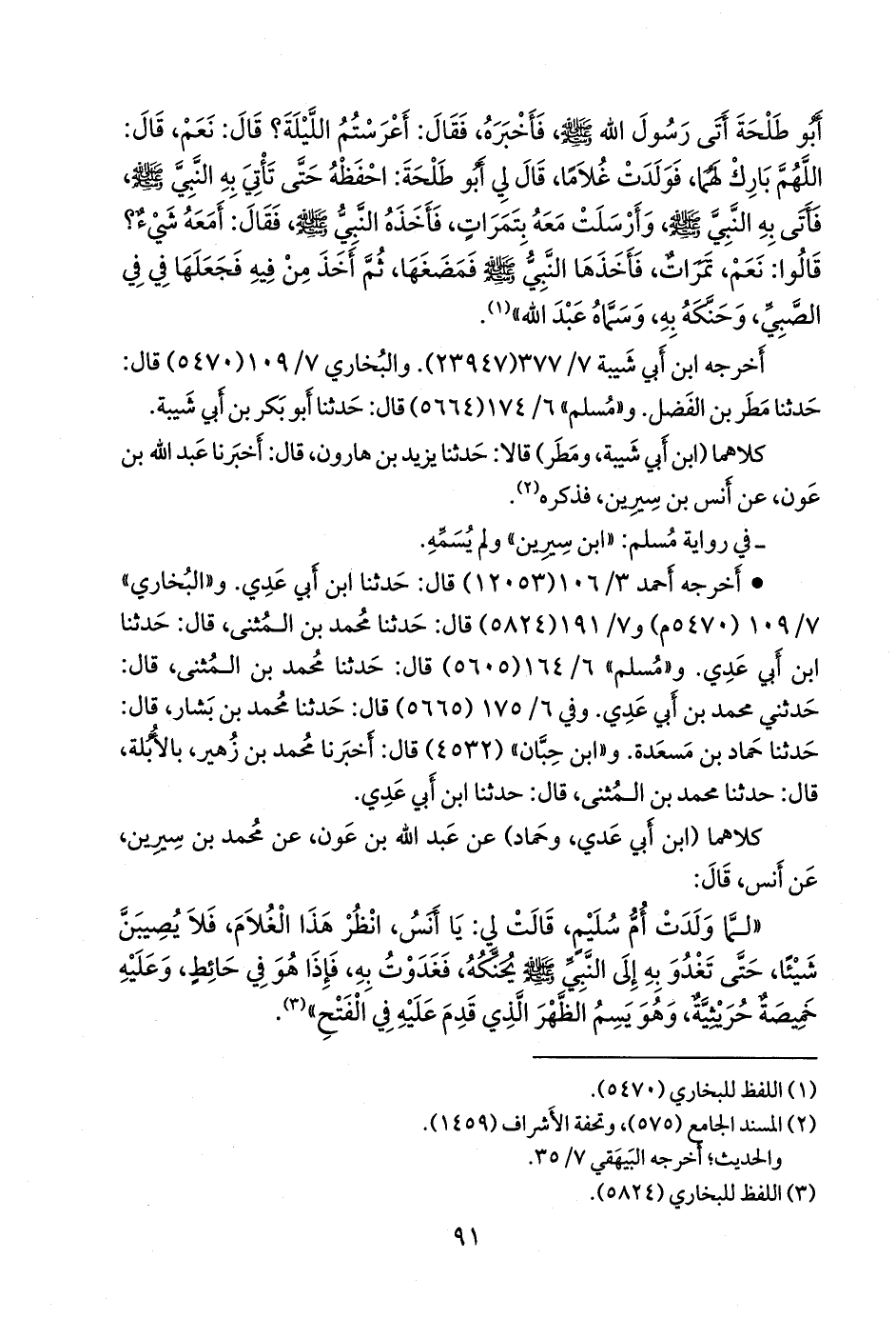 «لما ولدت أُم سُليم، قالت لي: يا أنس، انظر هذا الغلام، فلا يصيبن شيئا، حتى تغدو به إلى النبي صَلى الله عَليه وسَلم يحنكه، فغدوت به، فإذا هو في حائط، وعليه خميصة حريثية، وهو يسم الظهر الذي قدم عليه في الفتح» (¬١).