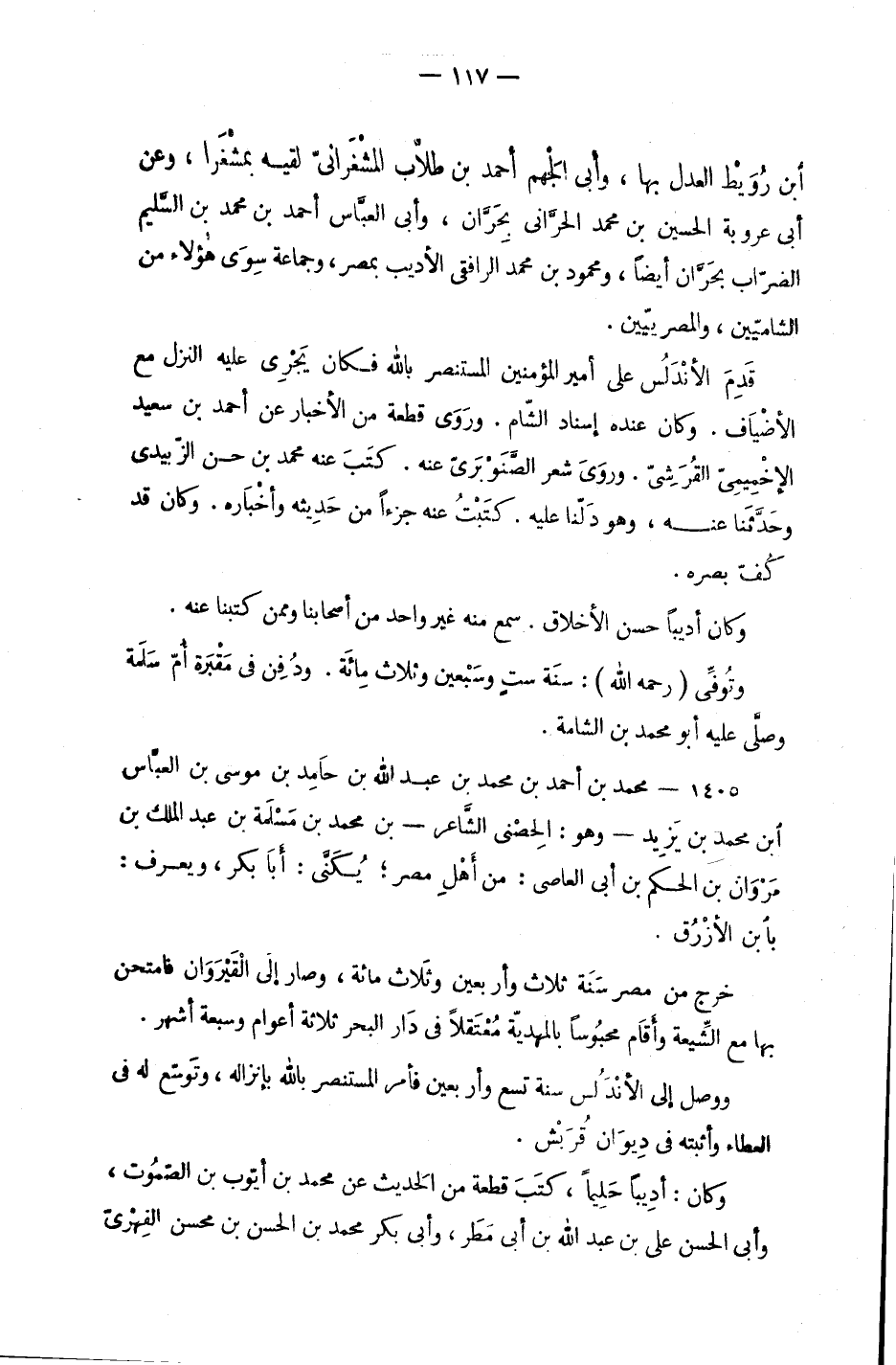1405 - محمد بن أحمد بن محمد بن عبد الله حَامِد بن موسى بن العبَّاس ابن محمد بن يَزيد - وهو: الحِصْني الشَّاعر - بن محمد بن مَسْلَمة بن عبد الملك بن مَرْوَان بن الحكم بن أبي العاصي: من أَهْلِ مصر؛ يُكَنَّى: أبَا بكر، ويعرف: بابن الأزْرُق.