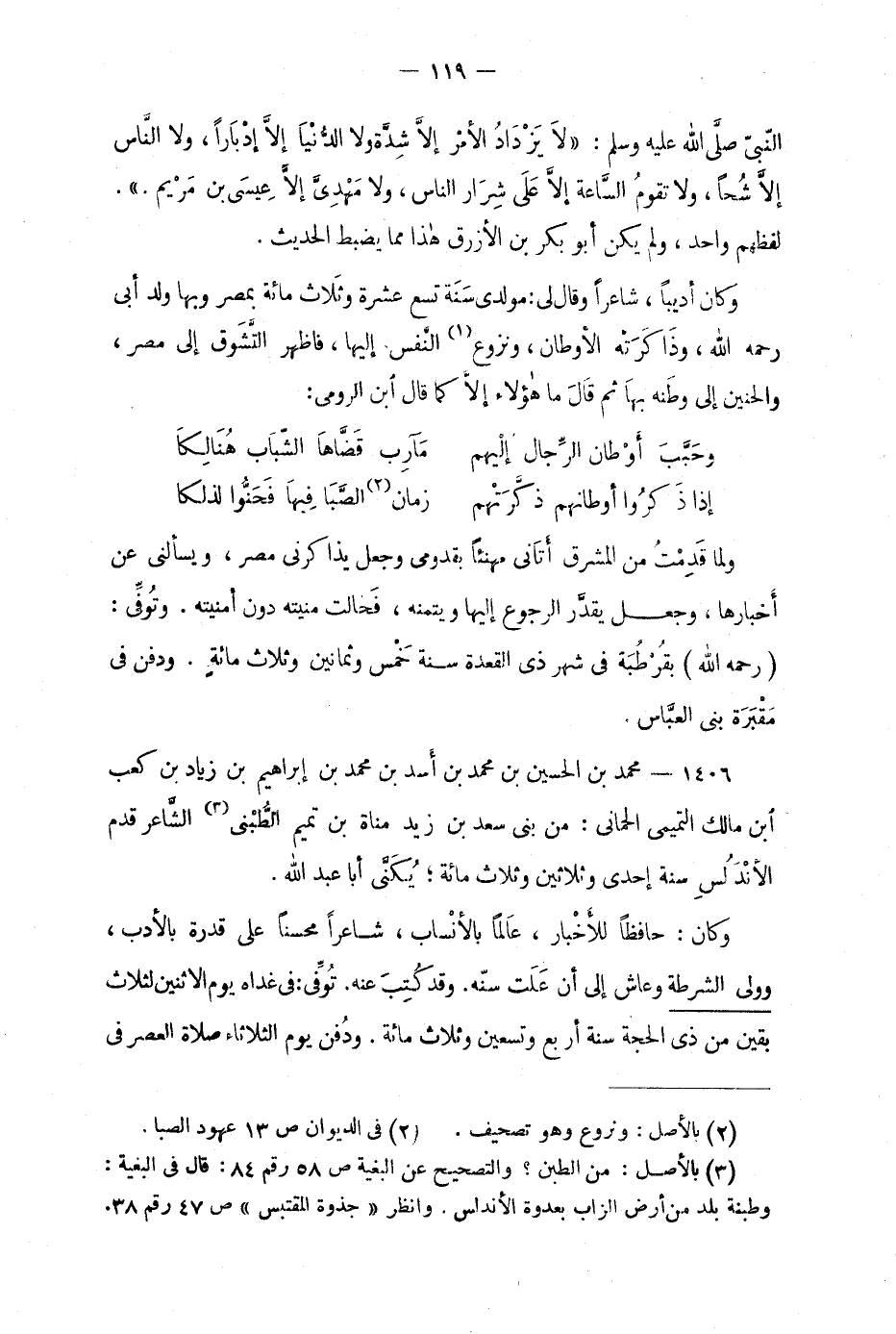 1406 - محمد بن الحسين بن محمد بن أسد بن محمد بن إبراهيم بن زياد بن كعب ابن مالك التميمي الحماني: من بني سعد بن زيد مناة بن تميم الطُّبْني الشَّاعر قدم الأنْدَلُس سنة إحدى وثلاثين وثلاث مائة؛ يُكَنَّى: أبَا عبد الله.