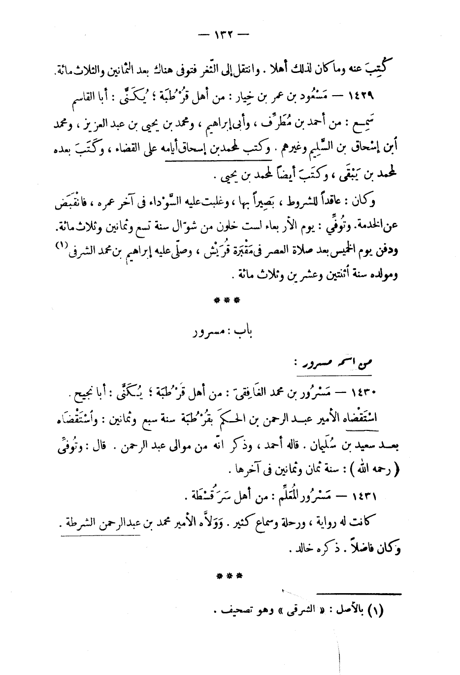 1430 - مَسْرُور بن محمد الغَافِقيّ: من أهل قُرْطُبَة؛ يُكَنَّى: أبا نجيح.
