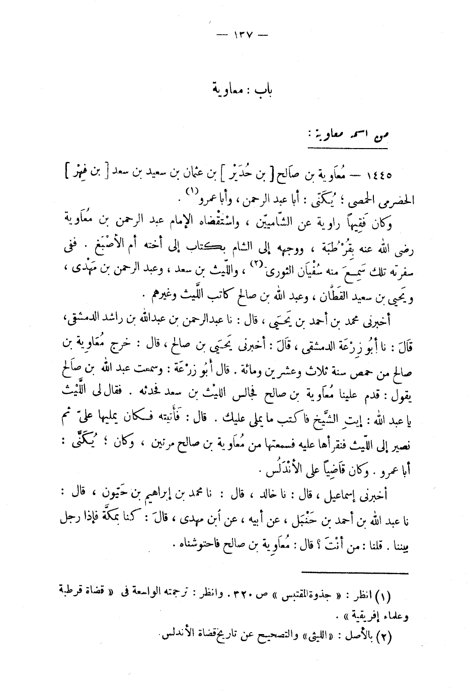 أخبرني محمد بن أحمد بن يَحيَى، قال: نا عَبْد الرَّحمن بن عَبْد الله بن راشد الدمشقي، قَالَ: نَا أبُو زِرْعَة الدمشقي، قالَ: أخبرني يِحيَى بن صالح، قال: خرج معاوية بن صالح من حمص سنة ثلاث وعشرين ومائة. قال أبو زرعة: وسمعت عبد الله بن صالح يقول: قدم علينا معاوية بن صالح فجالس الليث بن سعد فحدثه. فقال لى اللَّيث يا عبد الله: إيتِ الشيخ فاكتب ما يملى عليك. قال: فأتيته فكان يمليها على ثم نصير إلى الليث فنقرأها عليه فسمعتها من معاوية بن صالح مرتين، وكان؛ يكنى: أبا عمرو. وكان قاضيا على الأندلس.