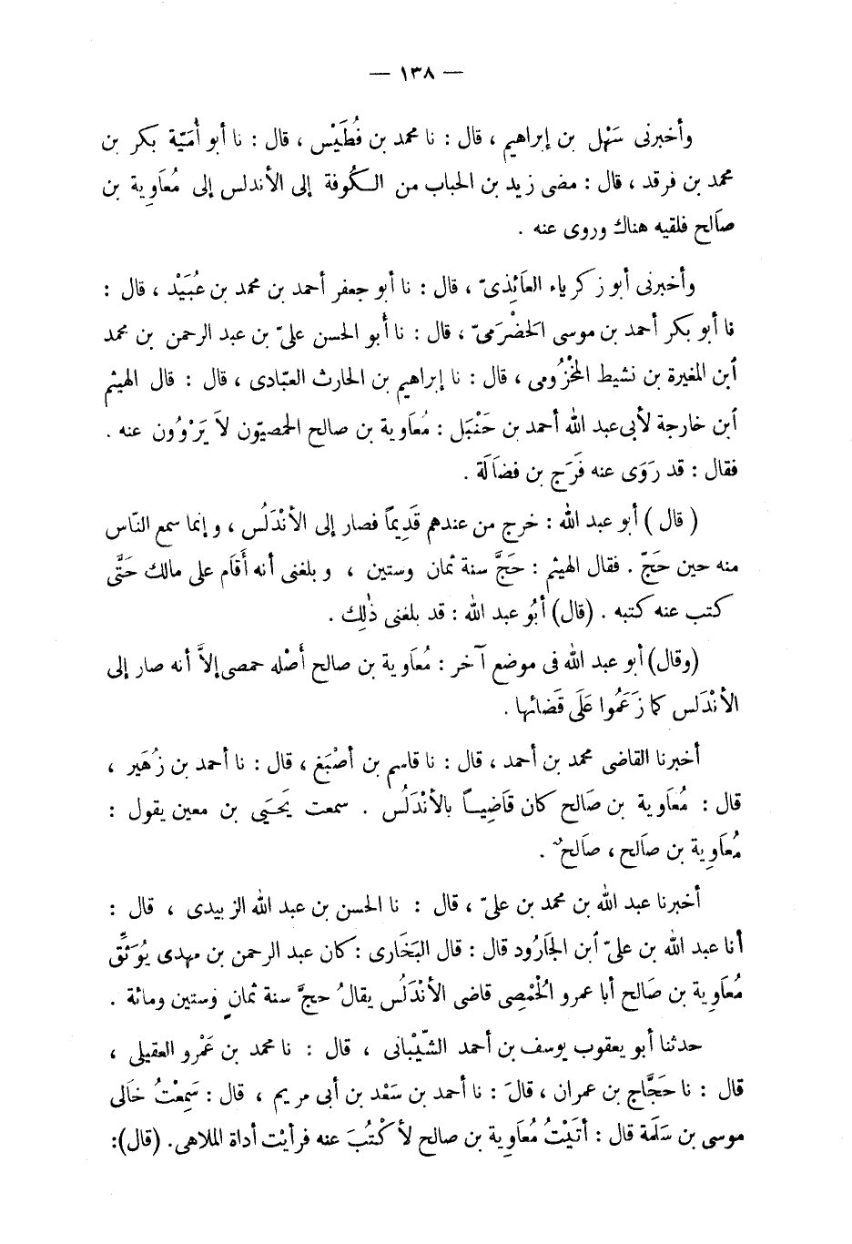 (وقال) أبو عَبْد الله في موضع آخر: مُعاوية بن صالح أصْله حمصي إلاَّ أنه صار إلى الأنْدَلس كما زَعَمُوا عَلَى قَضائها.
