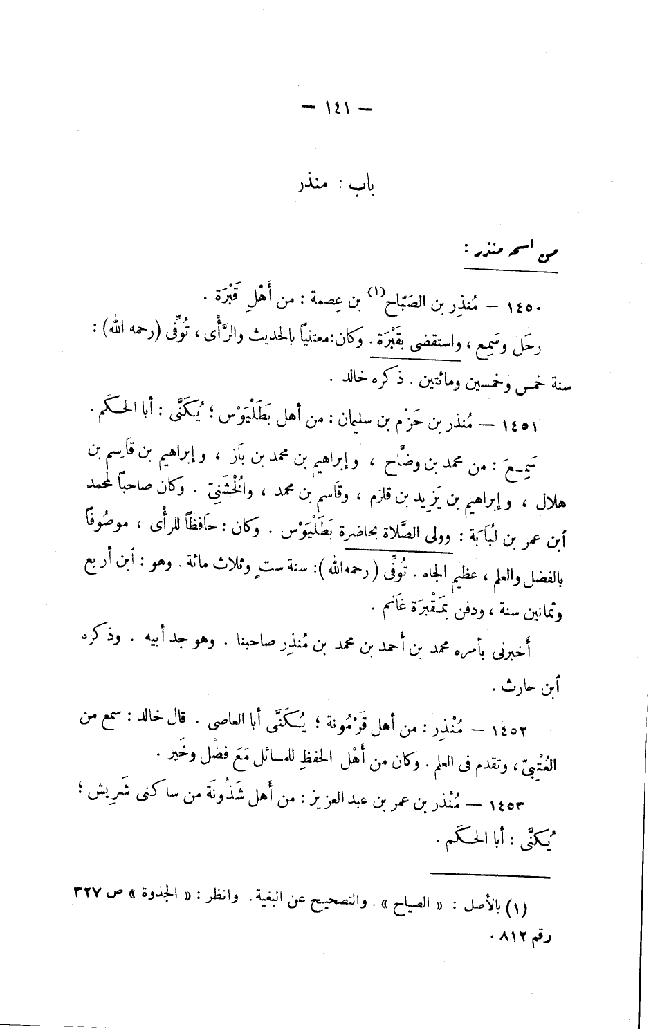 1453 - مُنذِر بن عمر بن عبد العزيز: من أهل شَذُونَة من ساكني شَرِيش؛ يُكَنَّى: أبا الحَكَم.