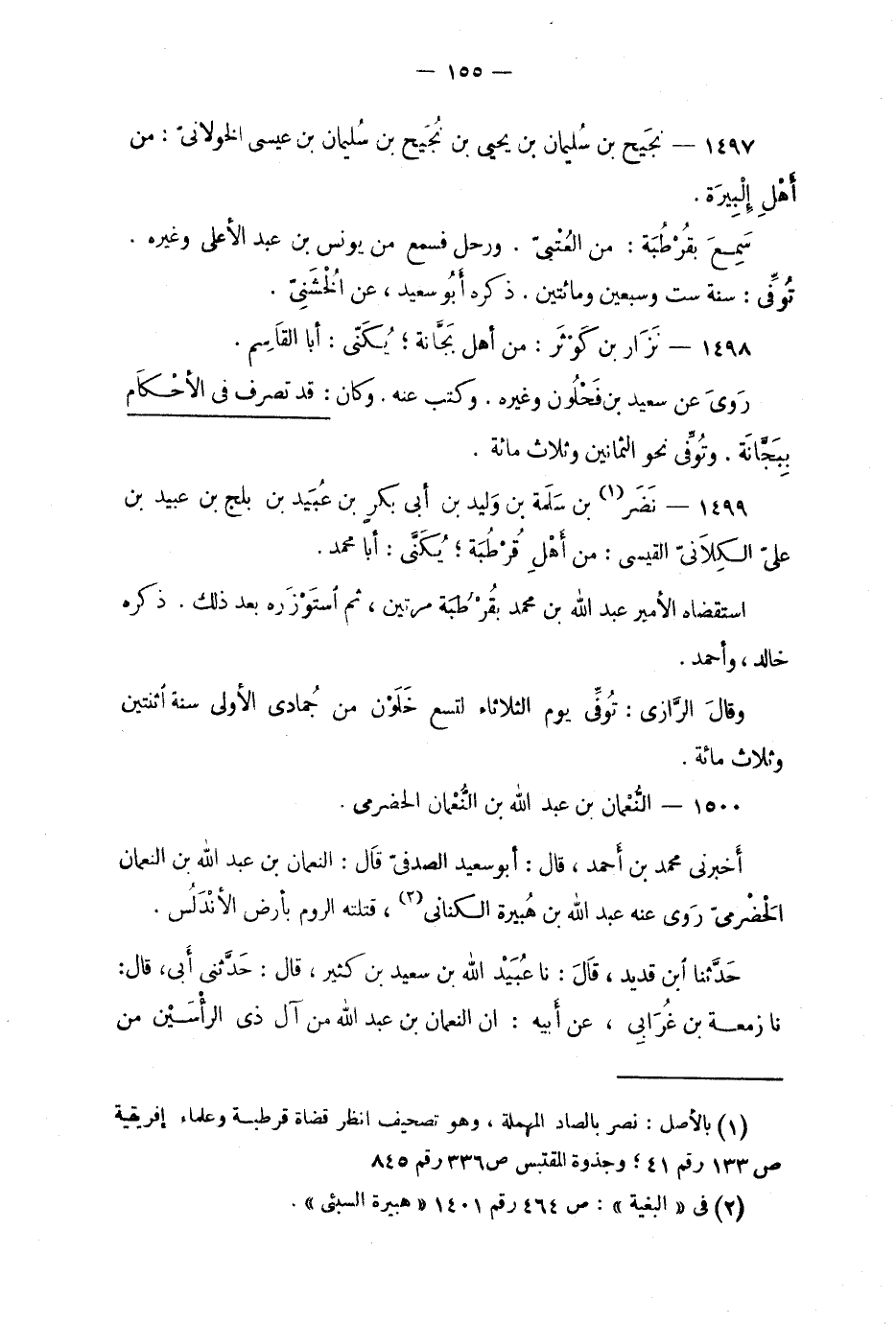 1499 - نَضَر بن سَلَمة بن وَليد بن أبي بكرٍ بن عُبَيْد بن بلج بن عبيد بن عليّ الكِلاَنيّ القيسي: من أهْلِ قُرْطُبة؛ يُكنّى: أبا محمد استقضاه الأمير عبد الله بن محمد بِقُرطُبة مرتين، ثم استَوْزَرهُ بعد ذلِك. ذكرهُ خالِد، وأحمد.