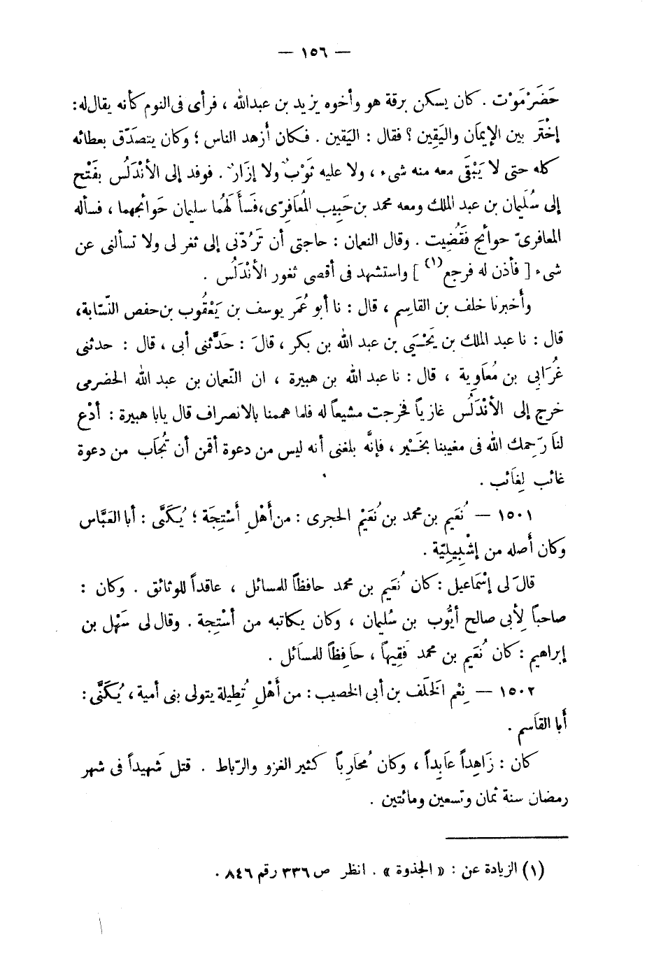 1501 - نُعيم بن محمد بن نُعَيم بن محمد حافظاً للمسائل، عاقداً للوثائق. وكان: صاحِباً لأبي صالح أيّوب بن سُليمان، وكان يكاتبه من أسْتِجة. وقال لي سَهْل بن إبراهِيم: كان نُعَيم بن محمد فَقيهاً، حافِظاً للمسائل.