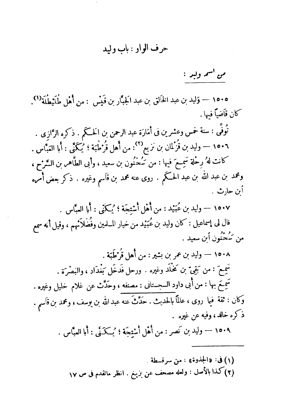 505 - وَليد بن عبد الخالق بن عبد الجّبار بن قَيْس: من أهل طُلَيْطُلَة. كان قاضِياً فيها. تُوفّي: سنة خمس وعشرين في إمارَة عبد الرحمن بن الحَكَم. ذكره الرَّازي.