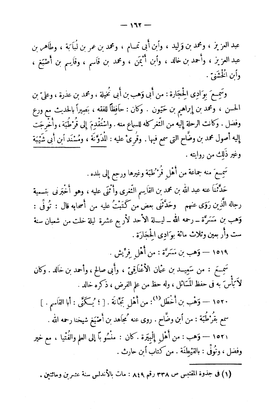 1521 - وَهب: من أهْلِ إلْبِيَرة. كان: منْسُوباً إلى العلم والفُتْيا، مع خير وفضل، وتُوفِّيَ: بالقيْطِنَة. من كتاب ابن حارث.