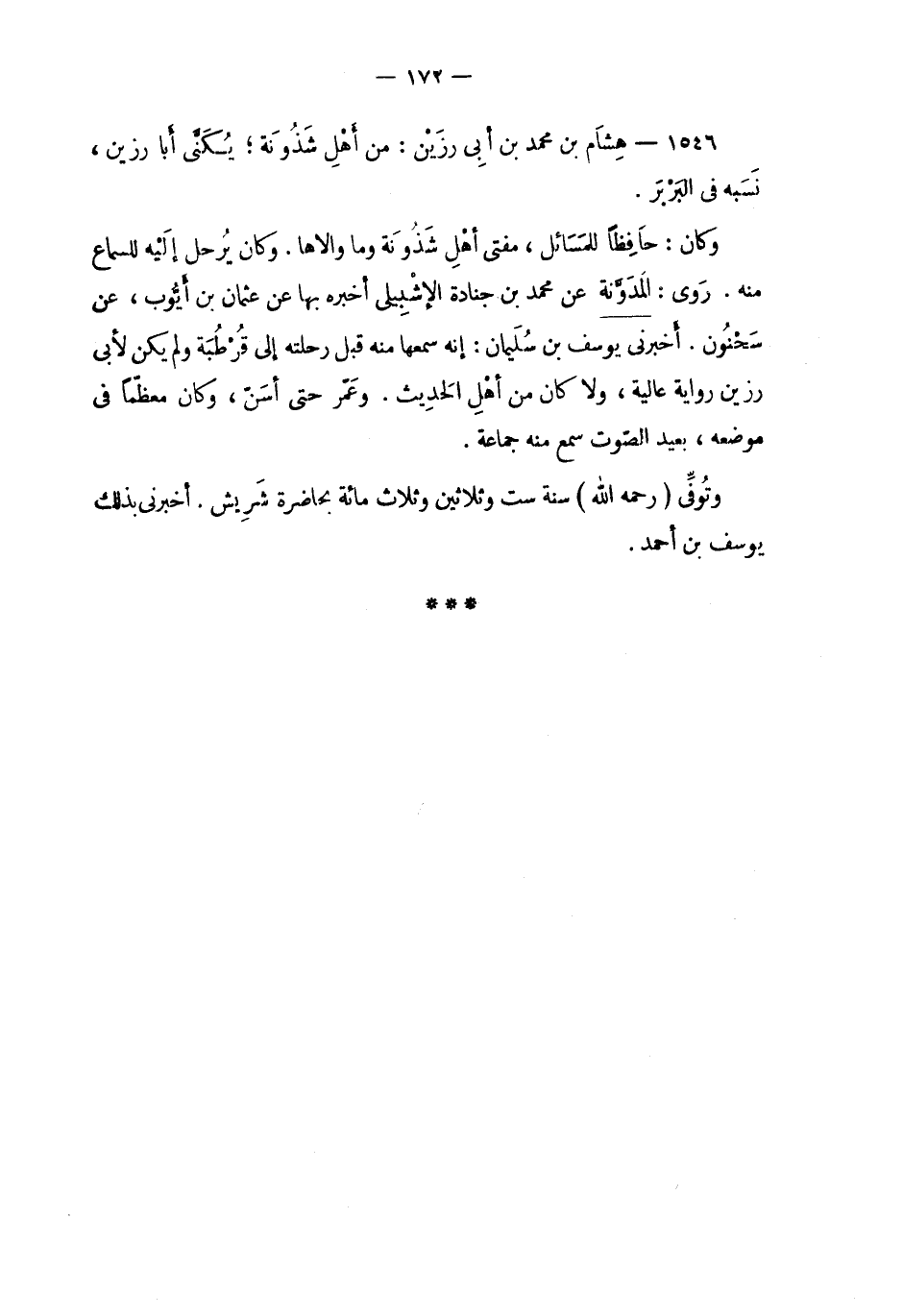 1546 - هِشَام بن محمد بن أبِي رزَيْن: من أَهْلِ شَذُونَة؛ يُكَنَّى: أبَا رزين، نَسَبه في البَرْبَر.