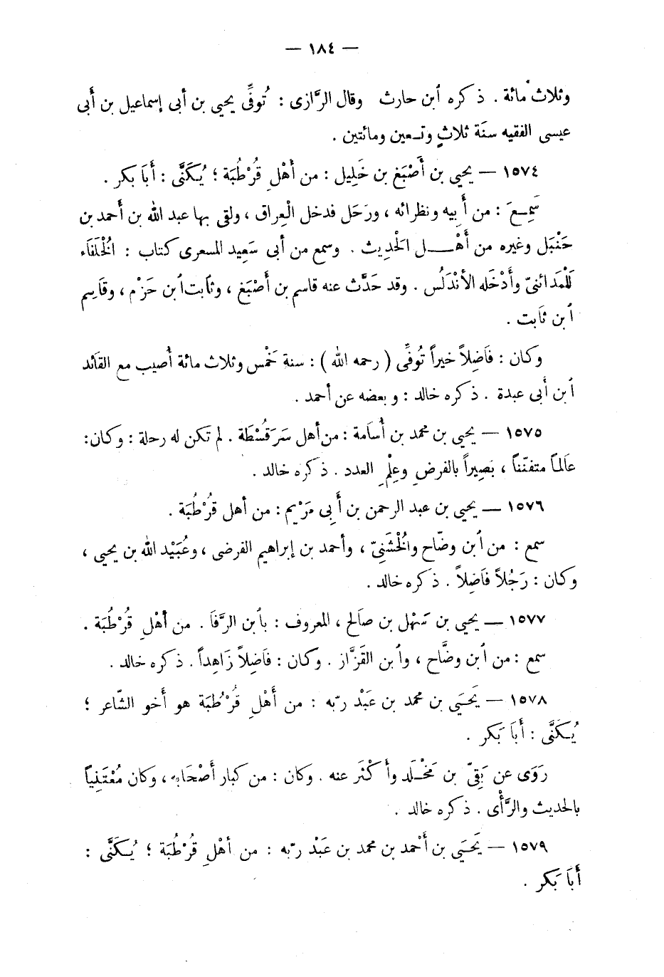 1574 - يحيى بن أصْبَغ بن خَلِيل: من أهْلِ قُرْطُبَة؛ يُكَنَّى: أبَا بكر.