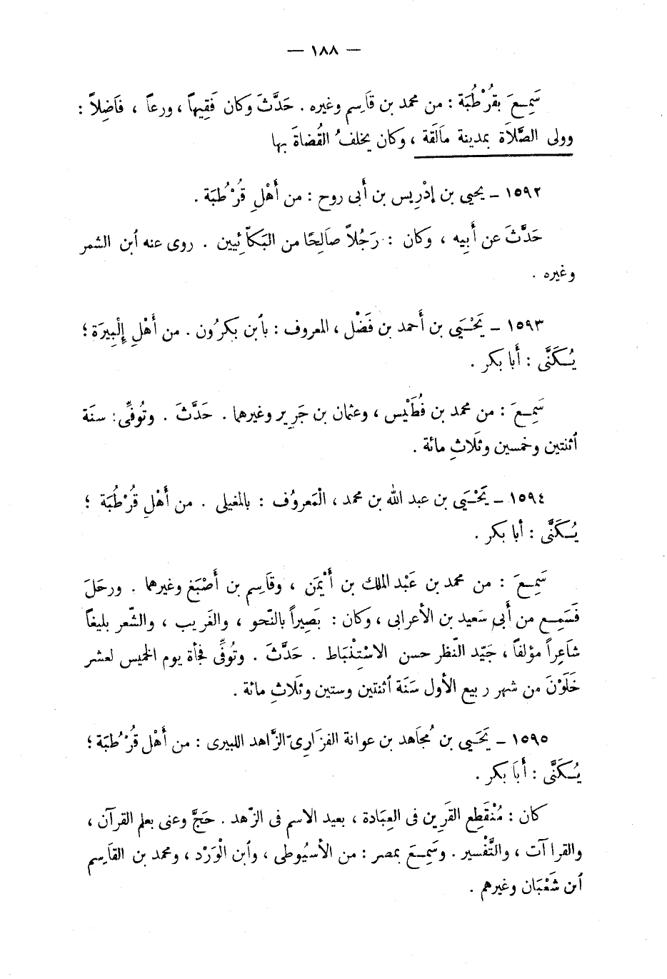 1595 - يَحْيَى بن مُجاهد بن عوانة الفزَاريّ الزَّاهد اللبيري: من أهْلِ قُرْطُبَة؛ يُكَنَّى: أبَا بكر.