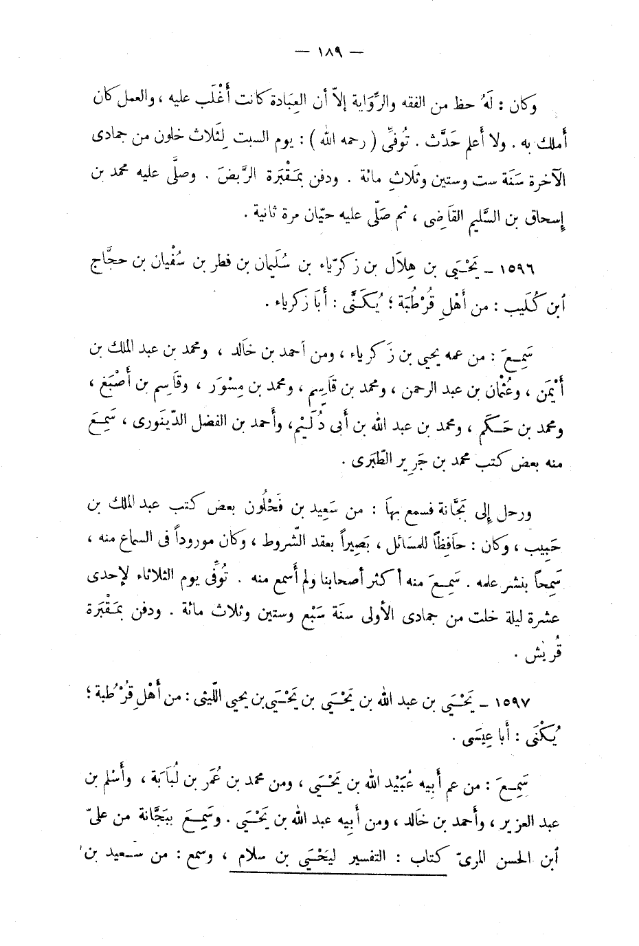 1596 - يَحْيَى بن هِلاَل بن زكرّياء بن سُلَيمان بن قطر سُفْيان بن حجّاج ابن كُلَيب: من أهْلِ قُرْطُبَة؛ يُكَنَّى: أبَا زكرياء.