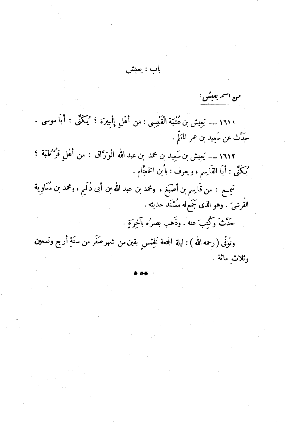 1611 - يَعيش بن عُتْبَة القَيسيّ: من أهلِ إلْبِيرَةَ؛ يُكَنّى: أبا موسى. حدّث عن سَعيد بن عُمر المعلّم.