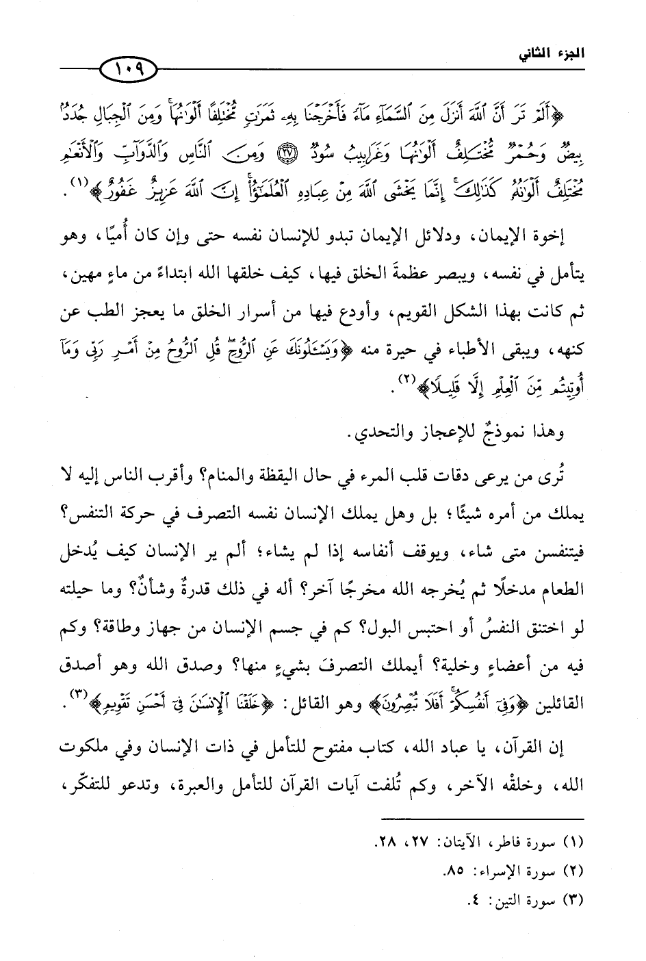 إخوة الإيمان، ودلائل الإيمان تبدو للإنسان نفسه حتى وإن كان أُميًا، وهو يتأمل في نفسه، ويبصر عظمةَ الخلق فيها، كيف خلقها الله ابتداءً من ماءٍ مهين، ثم كانت بهذا الشكل القويم، وأودع فيها من أسرار الخلق ما يعجز الطب عن كنهه، ويبقى الأطباء في حيرة منه {وَيَسْأَلُونَكَ عَنِ الرُّوحِ قُلِ الرُّوحُ مِنْ أَمْرِ رَبِّي وَمَا أُوتِيتُم مِّن الْعِلْمِ إِلاَّ قَلِيلاً} (¬2).