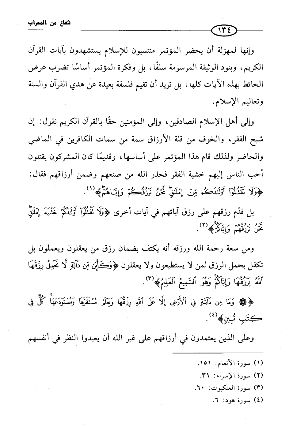 وإلى أهل الإسلام الصادقين، وإلى المؤمنين حقًا بالقرآن الكريم نقول: إن شبح الفقر، والخوف من قلة الأرزاق سمة من سمات الكافرين في الماضي والحاضر ولذلك قام هذا المؤتمر على أساسها، وقديمًا كان المشركون يقتلون أحب الناس إليهم خشية الفقر فحذر الله من صنعهم وضمن أرزاقهم فقال: {وَلاَ تَقْتُلُوا أَوْلاَدَكُم مِّنْ إمْلاَقٍ نَّحْنُ نَرْزُقُكُمْ وَإِيَّاهُمْ} (¬1).