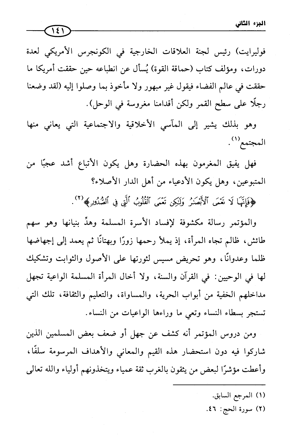 والمؤتمر رسالة مكشوفة لإفساد الأسرة المسلمة وهدِّ بنيانها وهو سهم طائش، ظالم تجاه المرأة، إذ يملأ رحمها زورًا وبهتانًا ثم يعمد إلى إجهاضها ظلما وعدوانًا، وهو تحريض مسيس لثورتها على الأصول والثوابت وتشكيك لها في الوحيين: في القرآن والسنة، ولا أخال المرأة المسلمة الواعية تجهل مداخلهم الخفية من أبواب الحرية، والمساواة، والتعليم والثقافة، تلك التي تستجر بسطاء النساء وتعي ما وراءها الواعيات من النساء.