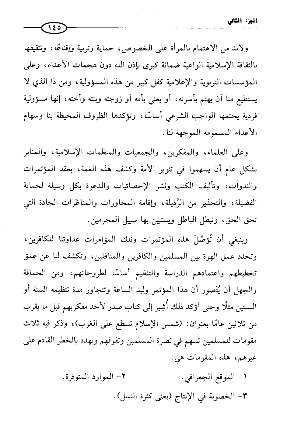 وينبغي أن تُؤصِّلَ هذه المؤتمرات وتلك المؤامرات عداوتنا للكافرين، وتحدد عمق الهوة بين المسلمين والكافرين والمنافقين، وتكشف لنا عن عمق تخطيطهم واعتمادهم الدراسة والتنظيم أساسًا لطروحاتهم، ومن الحماقة والجهل أن يُتَصور أن هذا المؤتمر وليد الساعة وتتجاوز مدة تنظيمه السنة أو السنتين مثلاً وحتى أؤكد ذلك أُشِير إلى كتاب صدر لأحد مفكريهم قبل ما يقرب من ثلاثين عامًا بعنوان: (شمس الإسلام تسطع على الغرب)، وذكر فيه ثلاث مقومات للمسلمين تسهم في نصرة المسلمين وتفوقهم ويهدد بالخطر القادم على غيرهم، هذه المقومات هي: