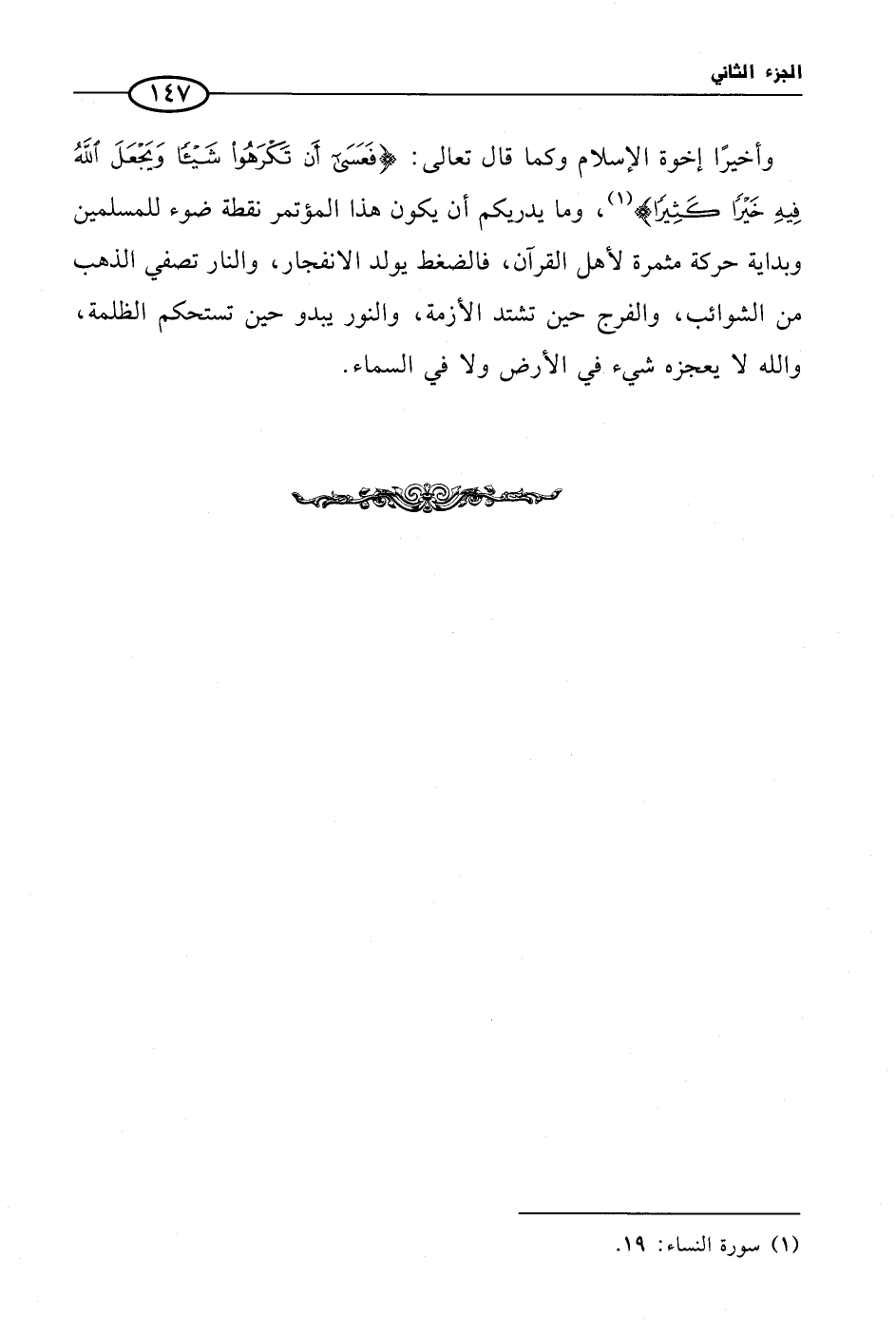 وأخيرًا إخوة الإسلام وكما قال تعالى: {فَعَسَى أَن تَكْرَهُوا شَيْئاً وَيَجْعَلَ اللَّهُ فِيهِ خَيْراً كَثِيراً} (¬1)، وما يدريكم أن يكون هذا المؤتمر نقطة ضوء للمسلمين وبداية حركة مثمرة لأهل القرآن، فالضغط يولد الانفجار، والنار تصفي الذهب من الشوائب، والفرج حين تشتد الأزمة، والنور يبدو حين تستحكم الظلمة، والله لا يعجزه شيء في الأرض ولا في السماء.