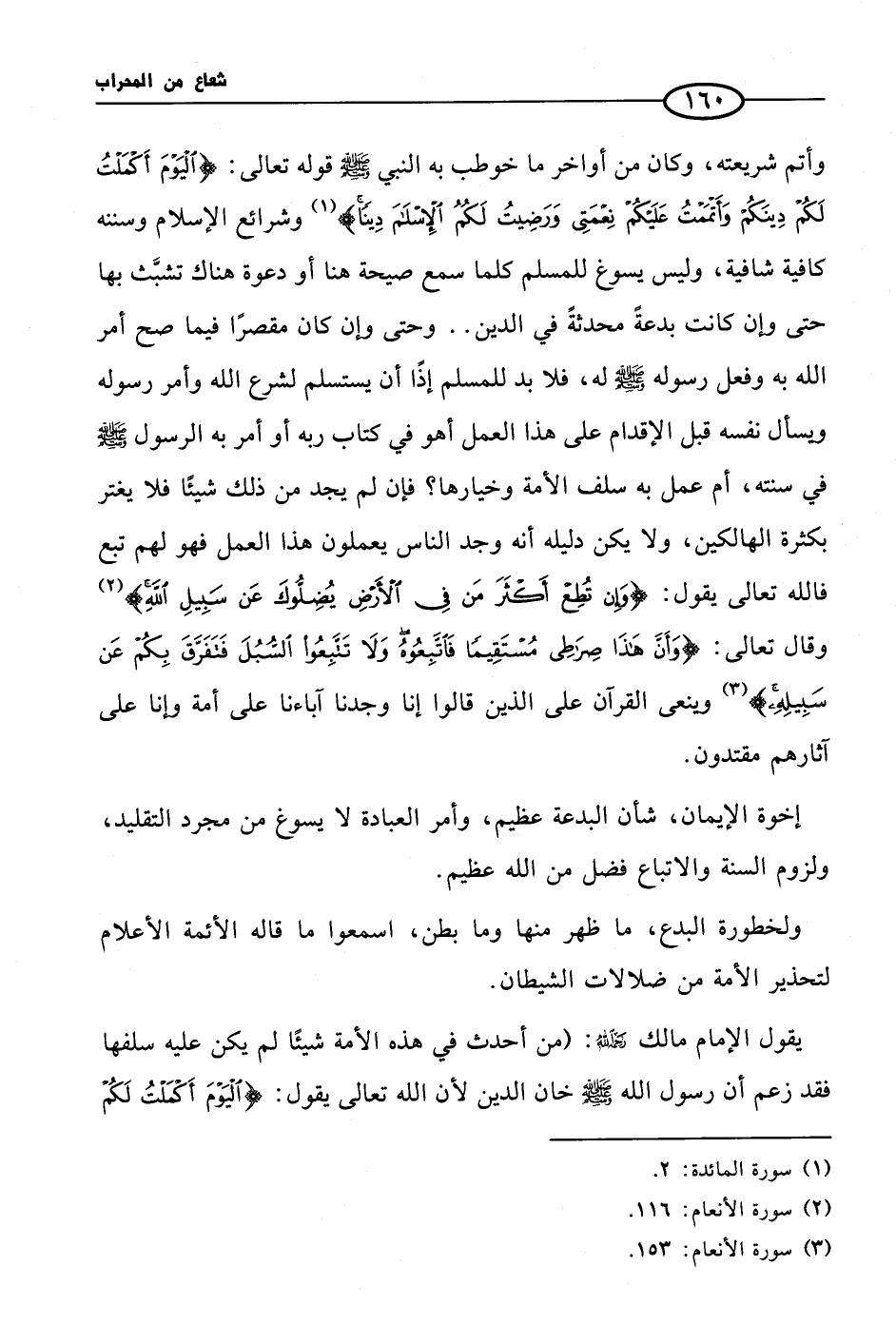 يقول الإمام مالك رحمه الله: (من أحدث في هذه الأمة شيئًا لم يكن عليه سلفها فقد زعم أن رسول الله صلى الله عليه وسلم خان الدين لأن الله تعالى يقول: {الْيَوْمَ أَكْمَلْتُ لَكُمْ