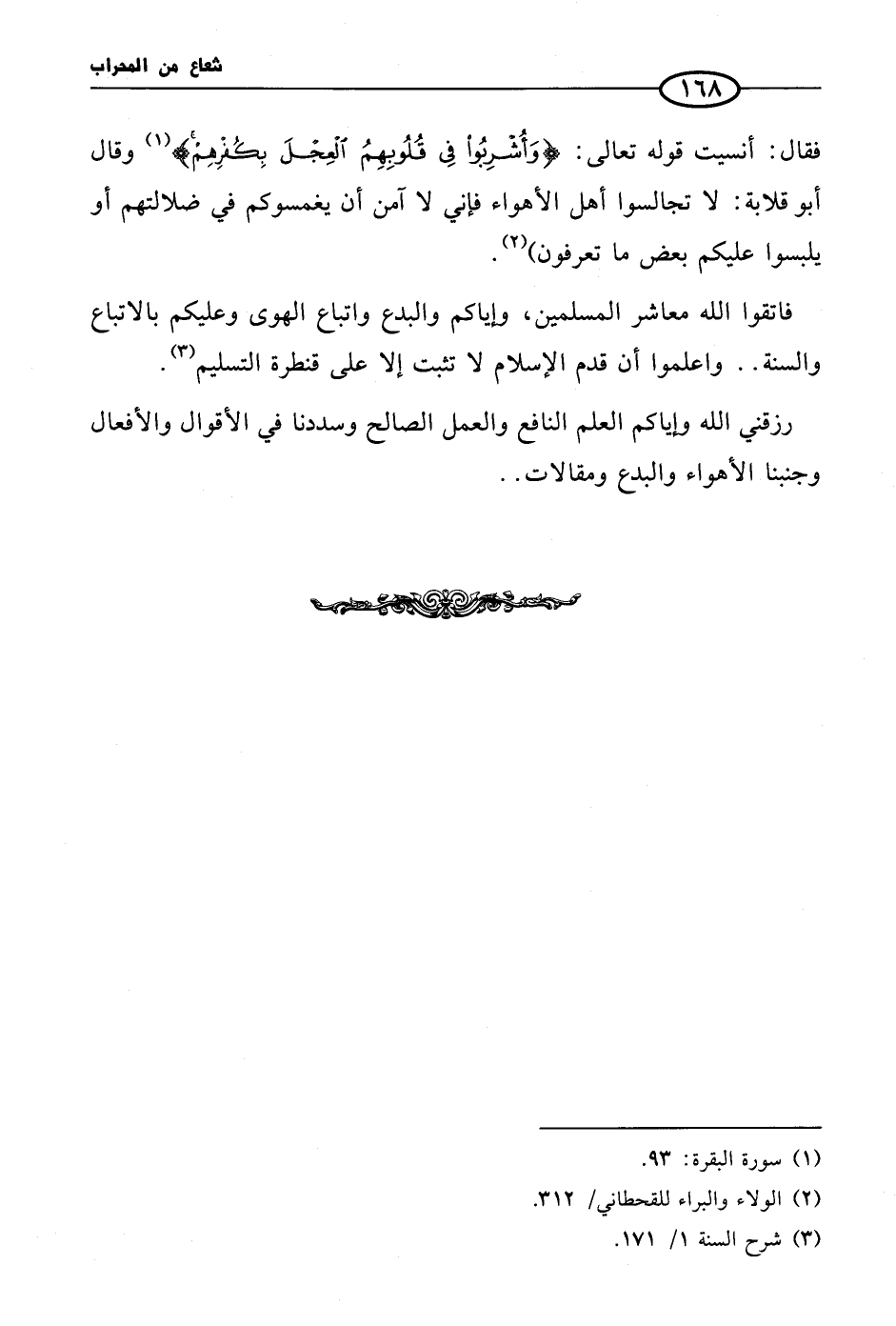 فاتقوا الله معاشر المسلمين، وإياكم والبدع واتباع الهوى وعليكم بالاتباع والسنة .. واعلموا أن قدم الإسلام لا تثبت إلا على قنطرة التسليم (¬3).