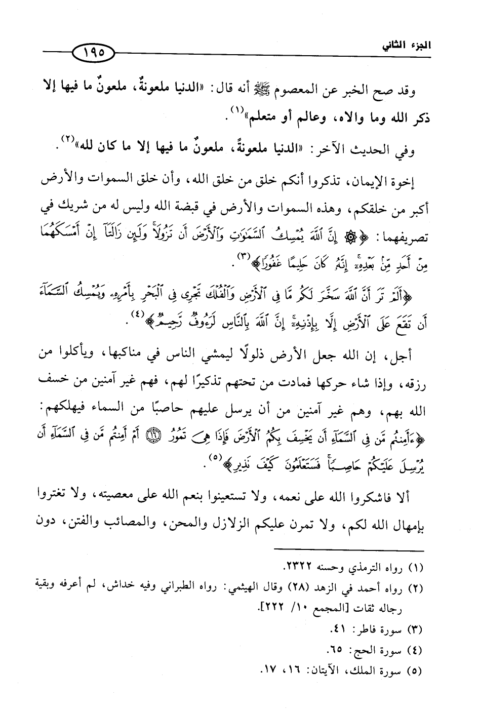 وقد صح الخبر عن المعصوم صلى الله عليه وسلم أنه قال: «الدنيا ملعونةٌ، ملعونٌ ما فيها إلا ذكر الله وما والاه، وعالم أو متعلم» (¬1). وفي الحديث الآخر: «الدنيا ملعونةً، ملعونٌ ما فيها إلا ما كان لله» (¬2).
