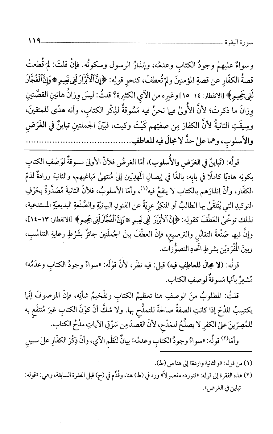 قوله: (تباينٌ في الغرض والأسلوب)، أما الغرض فلأن الأولى مسوقةٌ لوصف الكتاب بكونه هادياً كاملاً في بابه، بالغاً في إيصال المهديين إلى منتهى مباغيهم، والثانية واردةٌ لذم الكفار، وأن إنذارهم بالكتاب لا ينفع فيه، وأما الأسلوب، فلأن الثانية مصدرةٌ بحرف التوكيد التي يُتلقى بها الطالب أو المنكر عريةً عن الفنون البيانية والصنعة البديعية المستدعية، لذلك توخى العطف كقوله: (إِنَّ الْأَبْرَارَ لَفِي نَعِيمٍ* وَإِنَّ الْفُجَّارَ لَفِي جَحِيمٍ) [الانفطار: 13 - 14]، وإن فيها صنعة التقابل والترصيع، فإن العطف بين الجملتين جائزٌ بشرط رعاية التناسب، وبين المفردين بشرط اتحاد التصورات.