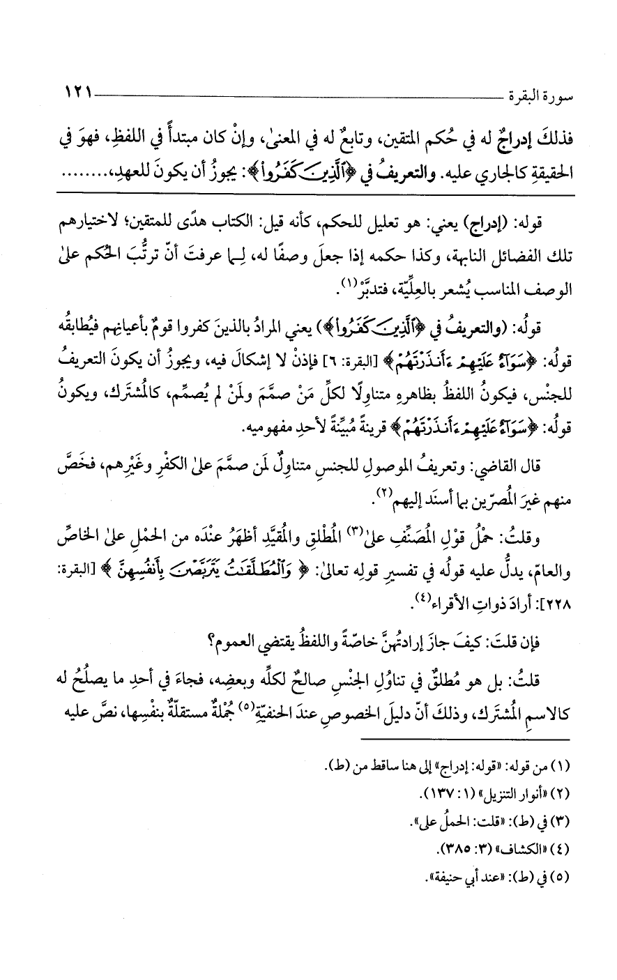 قوله: (والتعريف في (الَّذِينَ كَفَرُوا)) يعني المراد بالذين كفروا قومٌ بأعيانهم فيطابقه قوله: (سَوَاءٌ عَلَيْهِمْ أَأَنْذَرْتَهُمْ) [البقرة: 6] فإذن لا إشكال فيه، ويجوز أن يكون التعريف للجنسن فيكون اللفظ بظاهره متناولاً لكل من صمم ولمن لم يصمم، كالمشترك، ويكون قوله: (سَوَاءٌ عَلَيْهِمْ أَأَنْذَرْتَهُمْ) قرينةً مبينةً لأحد مفهوميه.