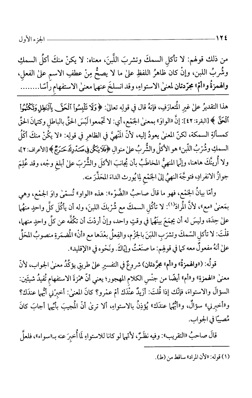 هذا التقدير على غير المتعارف، فإنه قال في قوله تعالى: (وَلا تَلْبِسُوا الحَقَّ بِالْبَاطِلِ وَتَكْتُمُوا الحَقَّ) [البقرة: 42]: إن ((الواو)) بمعنى الجمع، أي: لا تجمعوا لبس الحق بالباطل وكتمان الحق كمسألة السمكة، لكن المعنى يعود إليه، لأن المنهي في الظاهر في قوله: ((لا يكن منك أكل السمك وشرب اللبن)) هو الأكل والشرب على منوال (فَلا يَكُن فِي صَدْرِكَ حَرَجٌ) [الأعراف: 2]، ولا أرينك ها هنا، وإنما المنهي المخاطب بأن يجانب الأكل والشرب على أبلغ وجه، وقد علم جواز الانفراد، فتوجه النهي إلى الجمع لما يورث الداء المحذر منه.