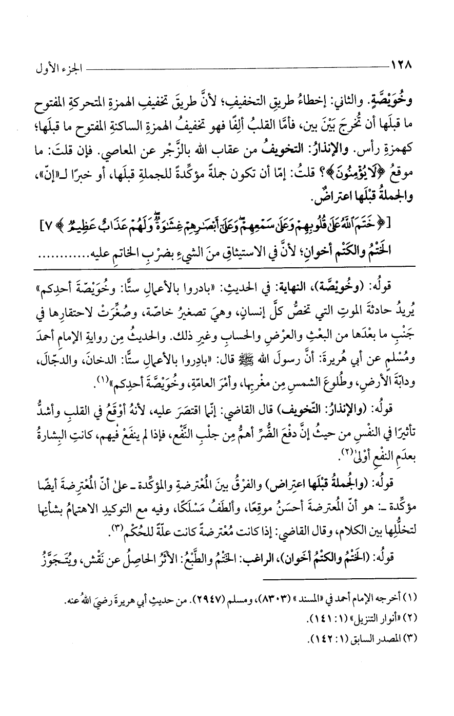 وخويصة. والثاني: إخطاء طريق التخفيف لأن طريق تخفيف الهمزة المتحرّكة المفتوح ما قبلها أن تخرج بين بين فأما القلب ألفاً فهو تخفيف الهمزة الساكنة المفتوح ما قبلها كهمزة رأس. والإنذار: التخويف من عقاب اللَّه بالزجر عن المعاصي. فإن قلت: ما موقع (لا يُؤْمِنُونَ)؟ قلت: إمّا أن يكون جملة مؤكدة للجملة قبلها، أو خبراً لإنّ والجملة قبلها اعتراض.