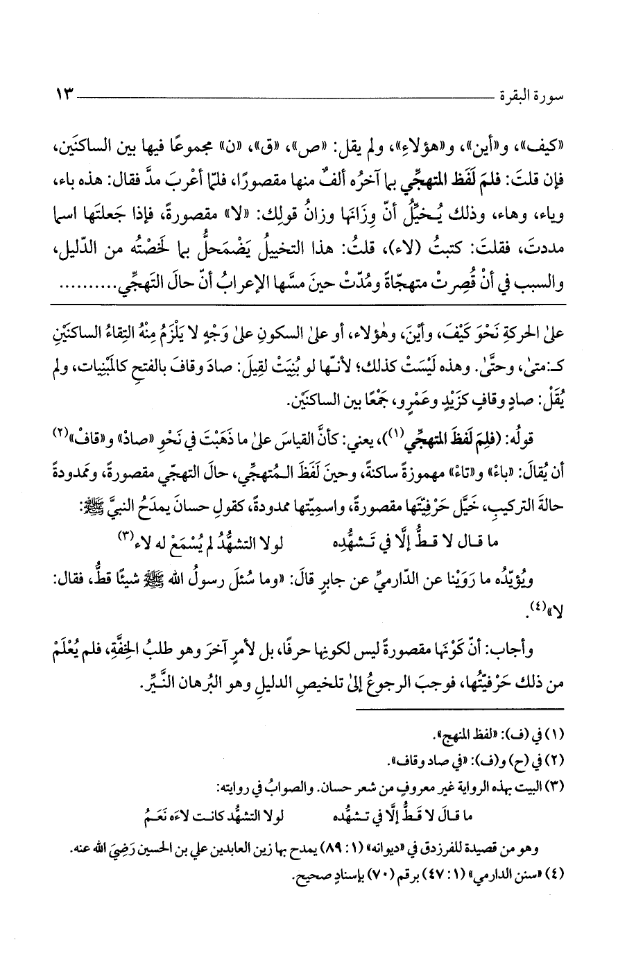 ((كيف))، و ((أين))، و ((هؤلاء)). ولم يقل: ((ص))، ((ق))، ((ن)) مجموعا فيها بين الساكنين. فإن قلت: فلم لفظ المتهجي بما آخره ألف منها مقصورا، فلما أعرب مدّ فقال: هذه باء، وياء، وهاء وذلك يخيل أن وِزانها وزان قولك ((لا)) مقصورة فإذا جعلتها اسما مددت فقلت: كتبت (لاء)؟ قلت: هذا التخيل يضمحل بما لخصته من الدليل والسبب في أن قُصرت متهجاة، ومدّت حين مسها الإعراب: أنّ حال التهجي