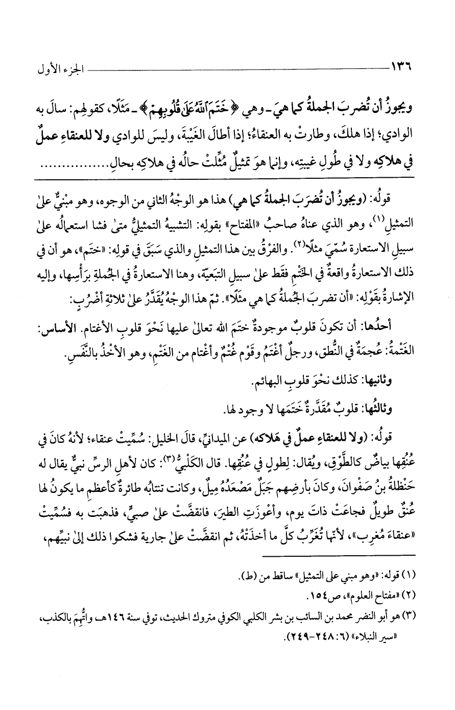 ويجوز أن تضرب الجملة كما هي - وهي (خَتَم اللَّهُ عَلَى قُلُوبِهِمْ) - مثلاً، كقولهم: سال به الوادي، إذا هلك. وطارت به العنقاء، إذا أطال الغيبة، وليس للوادي ولا للعنقاء عمل في هلاكه ولا في طول غيبته وإنما هو تمثيل مثلت حاله في هلاكه بحال