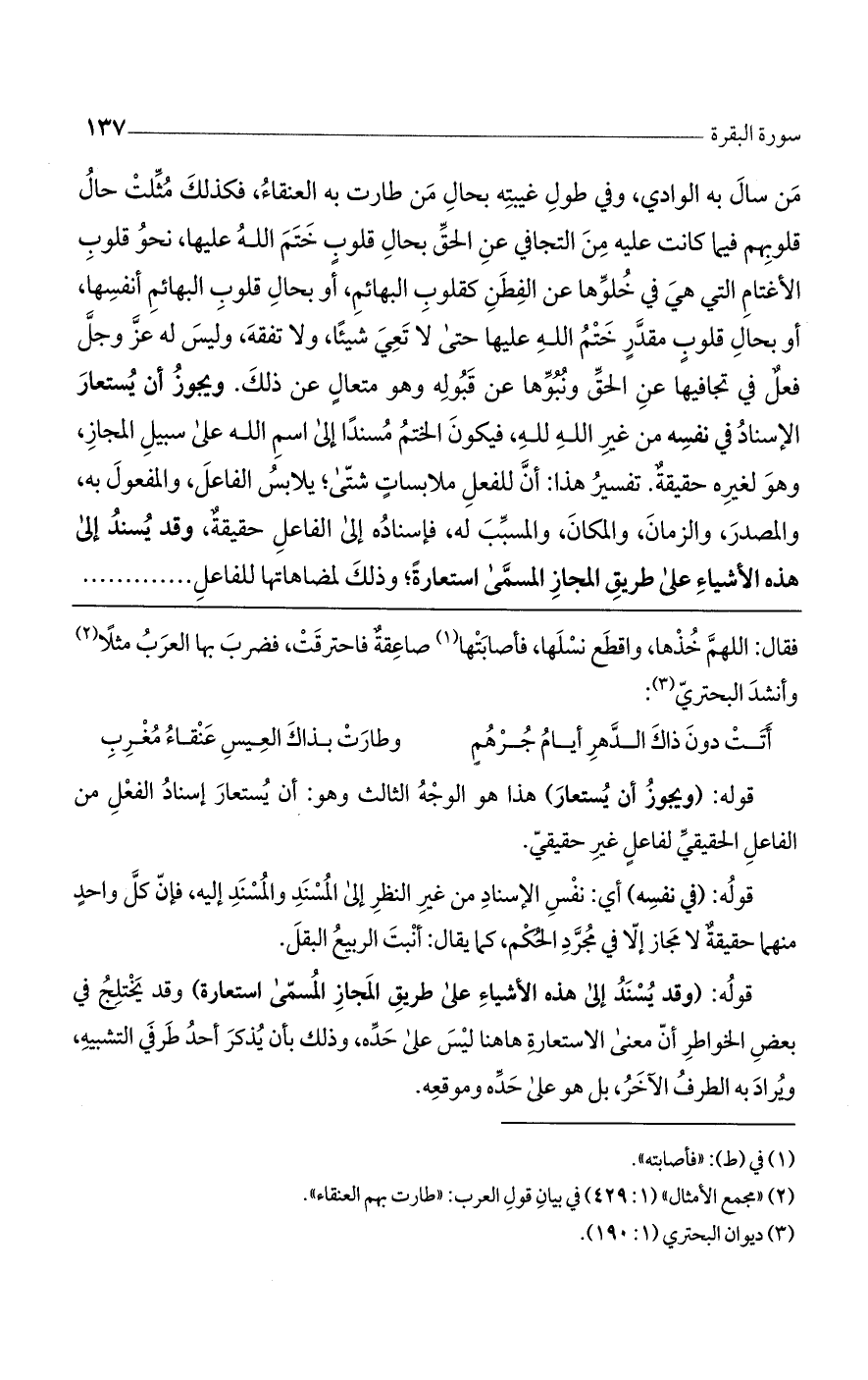 من سال به الوادي، وفي طول غيبته بحال من طارت به العنقاء فكذلك مثلت حال قلوبهم فيما كانت عليه من التجافي عن الحق بحال قلوب ختم اللَّه عليها نحو قلوب الأغتام «1» التي هي في خلوّها عن الفطن كقلوب البهائم، أو بحال قلوب البهائم أنفسها، أو بحال قلوب مقدّر ختم اللَّه عليها حتى لا تعبى شيئا ولا تفقه، وليس له عز وجل فعل في تجافيها عن الحق ونبوّها عن قبوله، وهو متعال عن ذلك. ويجوز أن يستعار الإسناد في نفسه من غير اللَّه للَّه، فيكون الختم مسنداً إلى اسم اللَّه على سبيل المجاز. وهو لغيره حقيقة. تفسير هذا: أنّ للفعل ملابسات شتى يلابس. الفاعل والمفعول به والمصدر والزمان والمكان والمسبب له فإسناده إلى الفاعل حقيقة، وقد يسند إلى هذه الأشياء على طريق المجاز المسمى استعارة وذلك لمضاهاتها للفاعل