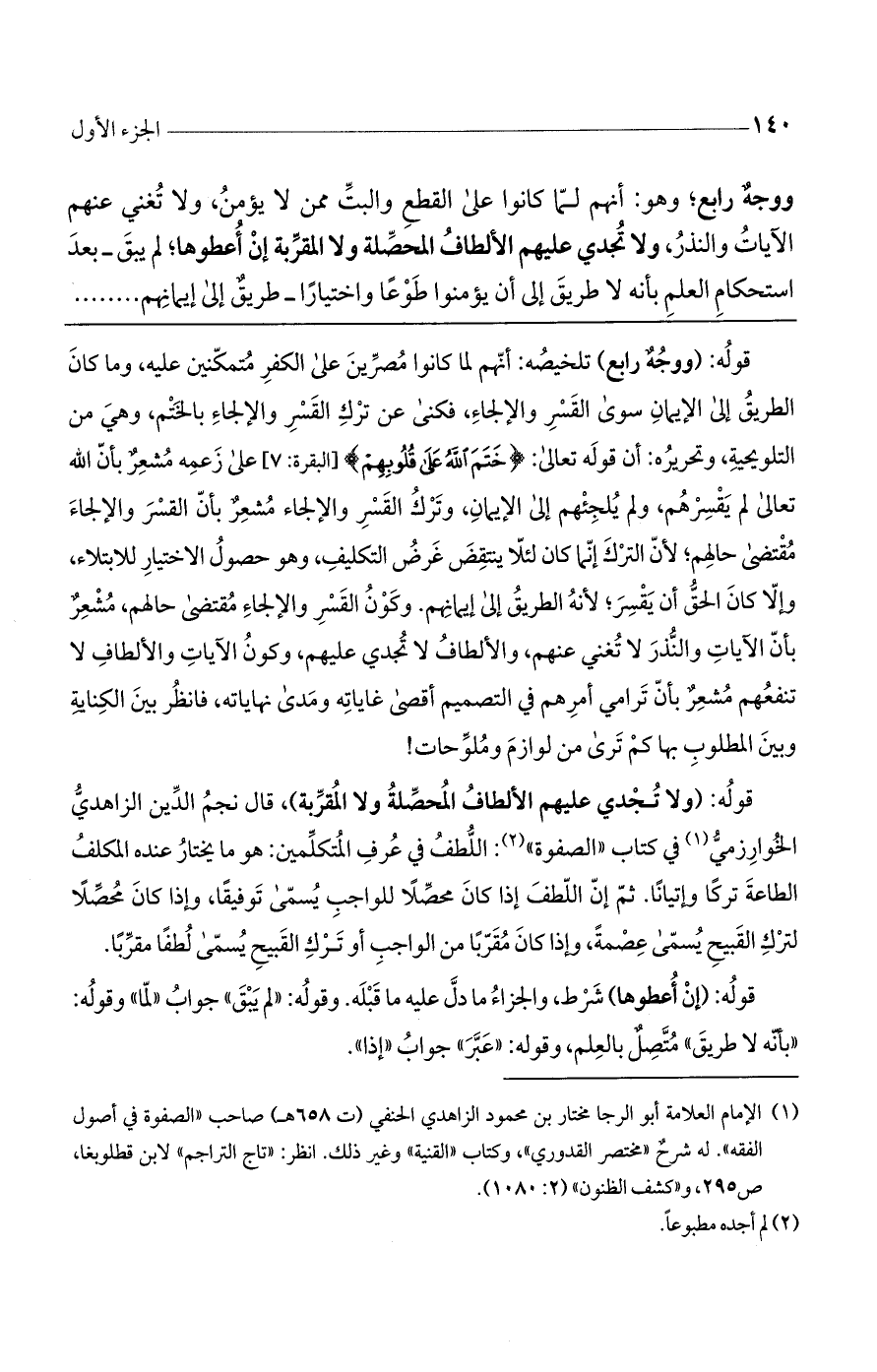قوله: (ولا تجدي عليهم الألطاف المحصلة ولا المقربة)، قال نجم الدين الزاهدي الخوارزمي في كتاب ((الصفوة)): اللطف في عرف المتكلمين: هو ما يختار عنده المكلف الطاعة تركاً وإتياناً. ثم إن اللطف إذا كان محصلاً للواجب يسمى توفيقاً، وإذا كان محصلاً لترك القبيح يسمى عصمةً، وإذا كان مقرباً من الواجب أو ترك القبيح يسمى لطفاً مقرباً.