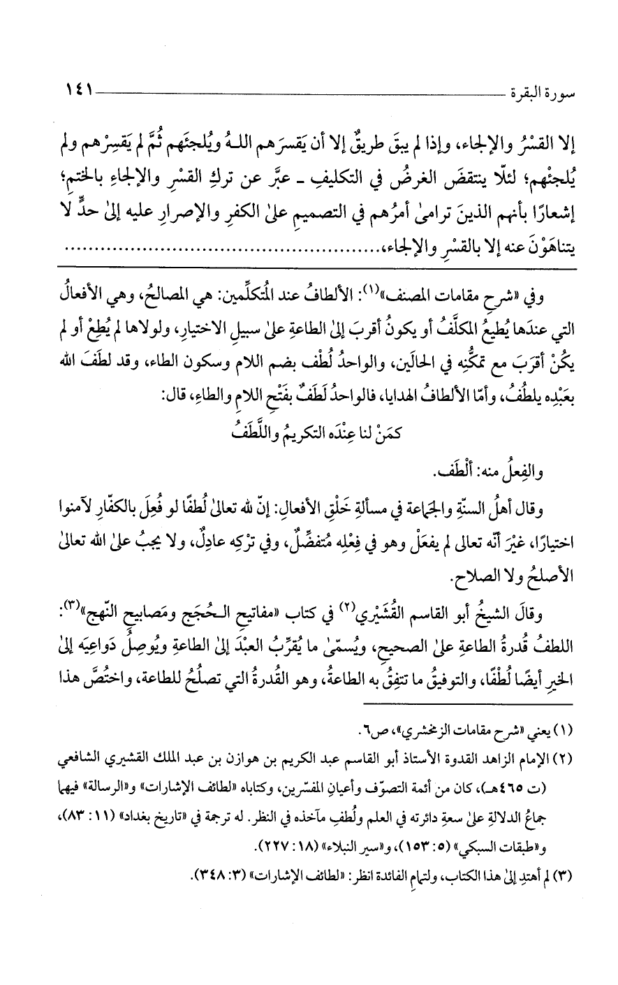 وقال الشيخ أبو القاسم القشيري في كتاب ((مفاتيح الحجج ومصابيح النهج)): اللطف قدوة الطاعة على الصحيح، ويسمى ما يقرب العبد إلى الطاعة ويوصل دواعيه إلى الخير أيضاً لطفاً، والتوفيق ما تتفق به الطاعة، وهو القدرة التي تصلح للطاعة، واختص هذا