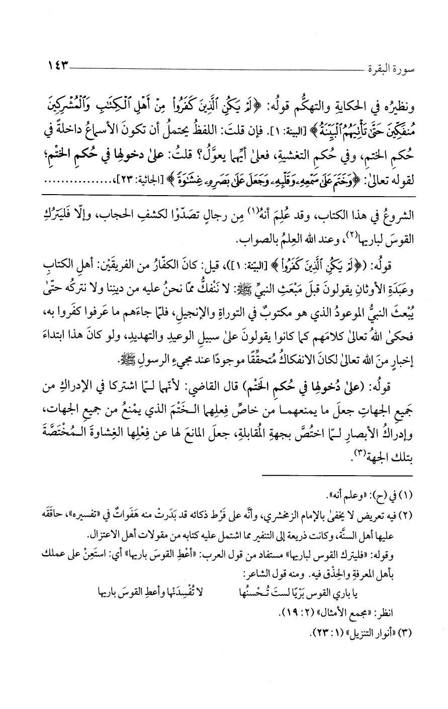 ونظيره في الحكاية والتهكم قوله: (لَمْ يَكُنِ الَّذِينَ كَفَرُوا مِنْ أَهْلِ الْكِتابِ وَالْمُشْرِكِينَ مُنْفَكِّينَ حَتَّى تَاتِيَهُمُ الْبَيِّنَةُ) [البينة: 1]. فإن قلت: اللفظ يحتمل أن تكون الأسماع داخلة في حكم الختم وفي حكم التغشية، فعلى أيهما يعوّل؟ قلت: على دخولها في حكم الختم لقوله تعالى: (وَخَتَمَ عَلى سَمْعِهِ وَقَلْبِهِ، وَجَعَلَ عَلى بَصَرِهِ غِشاوَةً) [الجاثية: 23]،
