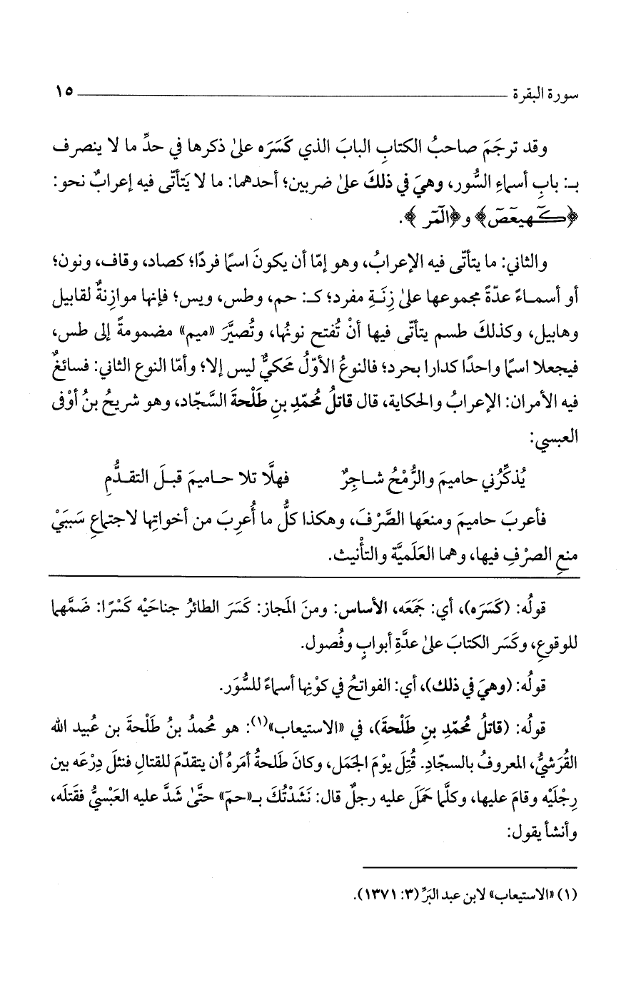 والثاني: ما يتأتى فيه الإعراب، وهو إما أن يكون اسما فردا كصاد وقاف ونون، أو أسماء عدّة مجموعها على زنة مفرد ك: حم. وطس. ويس. فإنها موازنة لقابيل وهابيل، وكذلك طسم يتأتى فيها أن تفتح نونها، وتصير ((ميم)) مضمومة إلى طس فيجعلا اسماء واحد كدارابجرد فالنوع الأول محكي ليس إلا وأما النوع الثاني فسائغ فيه الأمران: الإعراب، والحكاية قال قاتل محمد بن طلحة السجاد وهو شريح ابن أوفى العبسي