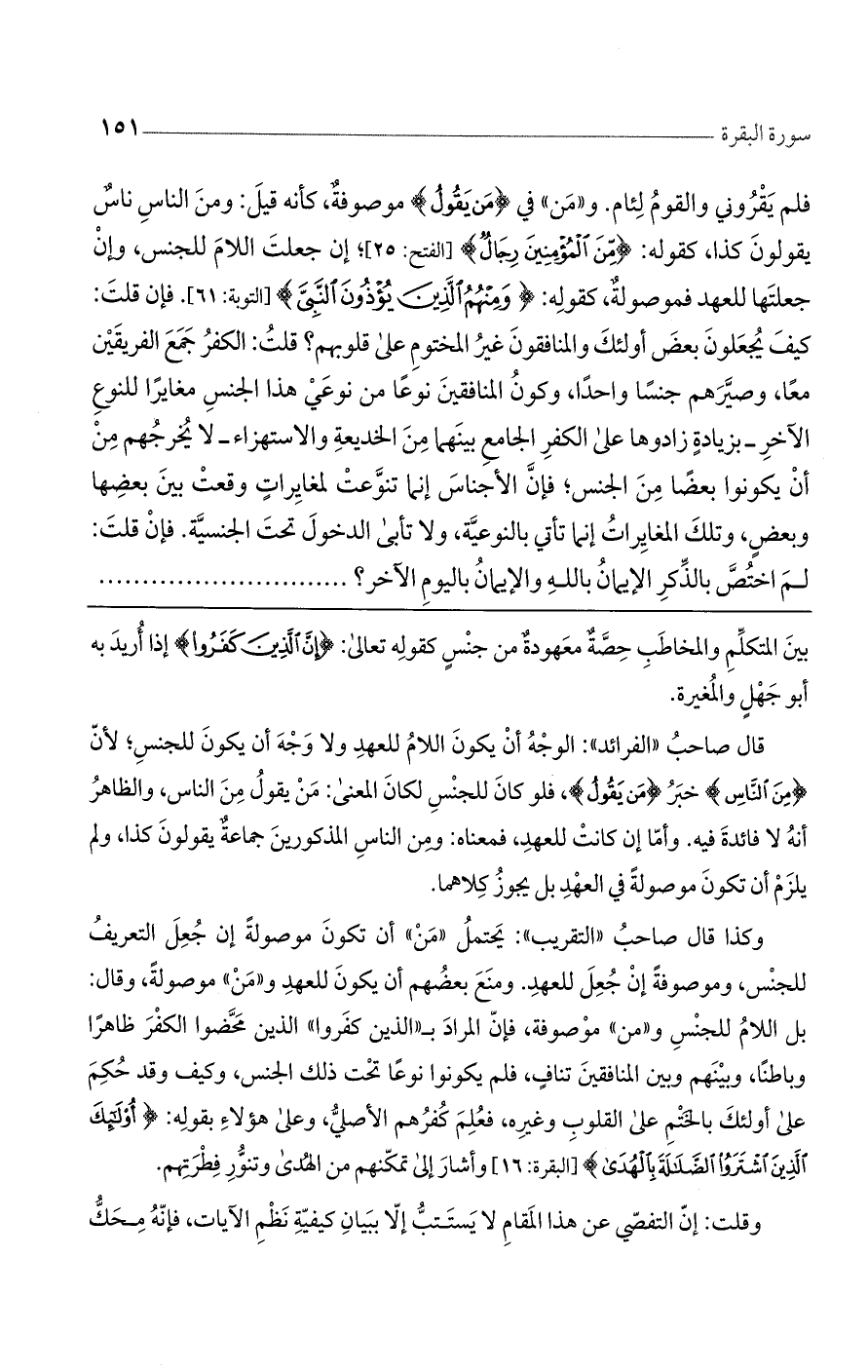 وكذا قال صاحب ((التقريب)): يحتمل ((من)) أن تكون موصولةً إن جعل التعريف للجنس، وموصوفةً إن جعل للعهد. ومنع بعضهم أن يكون للعهد و ((من)) موصولةً، وقال: بل اللام للجنس و ((من)) موصوفة، فإن المراد ب ((الذين كفروا)) الذين محضوا الكفر ظاهراً وباطناً، وبينهم وبين المنافقين تنافٍ، فلم يكونوا نوعاً تحت ذلك الجنس، وكيف وقد حكم على أولئك بالختم على القلوب وغيره، فعلم كفرهم الأصلي، وعلى هؤلاء بقوله: (أُولَئِكَ الَّذِينَ اشْتَرَوُا الضَّلالَةَ بِالْهُدَى) [البقرة: 16] وأشار إلى تمكنهم من الهدى وتنور فطرتهم.