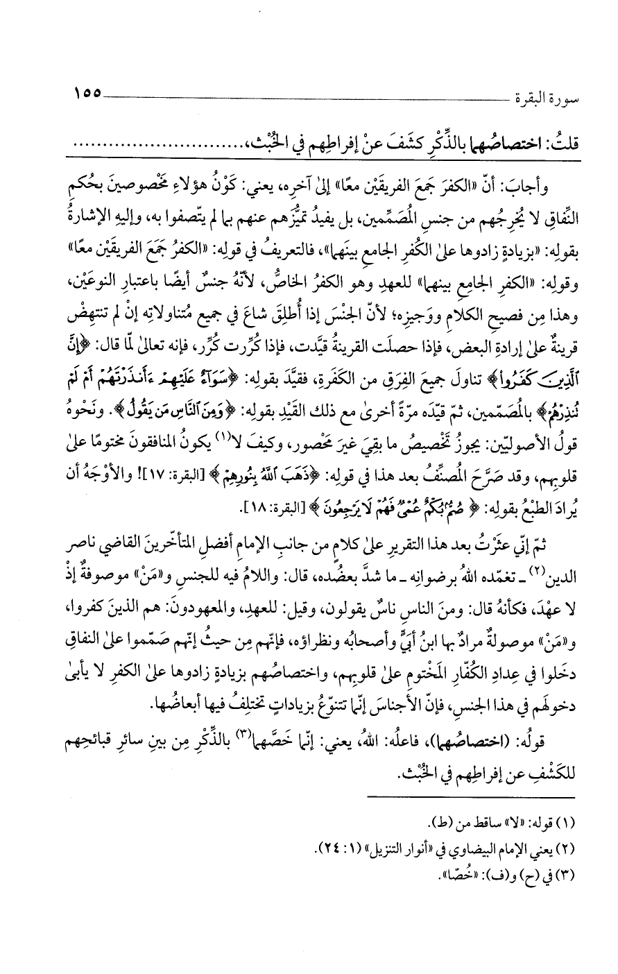 وأجاب: أن ((الكفر جمع الفريقين معاً)) إلى آخره، يعني: كون هؤلاء مخصوصين بحكم النفاق لا يخرجهم من جنس المصممين، بل يفيد تميزهم عنهم بما لم يتصفوا به، وإليه الإشارة بقوله: ((بزيادةٍ زادوها على الكفر الجامع بينهما))، فالتعريف في قوله: ((الكفر جمع الفريقين معاً)) وقوله: ((الكفر الجامع بينهما)) للعهد وهو الكفر الخاص، لأنه جنسٌ أيضاً باعتبار النوعين، وهذا من فصيح الكلام ووجيزه؛ لأن الجنس إذا أطلق شاع في جميع متناولاته إن لم تنتهض قرينةٌ على إرادة البعض، فإذا حصلت القرينة قيدت، فإذا كررت كرر، فإنه تعالى لما قال: (إنَّ الَّذِينَ كَفَرُوا) تناول جميع الفرق من الكفرة، فقيد بقوله: (سَوَاءٌ عَلَيْهِمْ أَأَنذَرْتَهُمْ أَمْ لَمْ تُنذِرْهُمْ) بالمصممين، ثم قيده مرةً أخرى مع ذلك القيد بقوله: (وَمِنَ النَّاسِ مَن يَقُولُ). ونحوه قول الأصوليين: يجوز تخصيص ما بقي غير محصور، وكيف لا يكون المنافقون مختوماً على قلوبهم، وقد صح المصنف بعد هذا في قوله: (ذَهَبَ اللَّهُ بِنُورِهِمْ) [البقرة: 17]! والأوجه أن يراد الطبع بقوله: (صُمٌّ بُكْمٌ عُمْيٌ فَهُمْ لا يَرْجِعُونَ) [البقرة: 18].