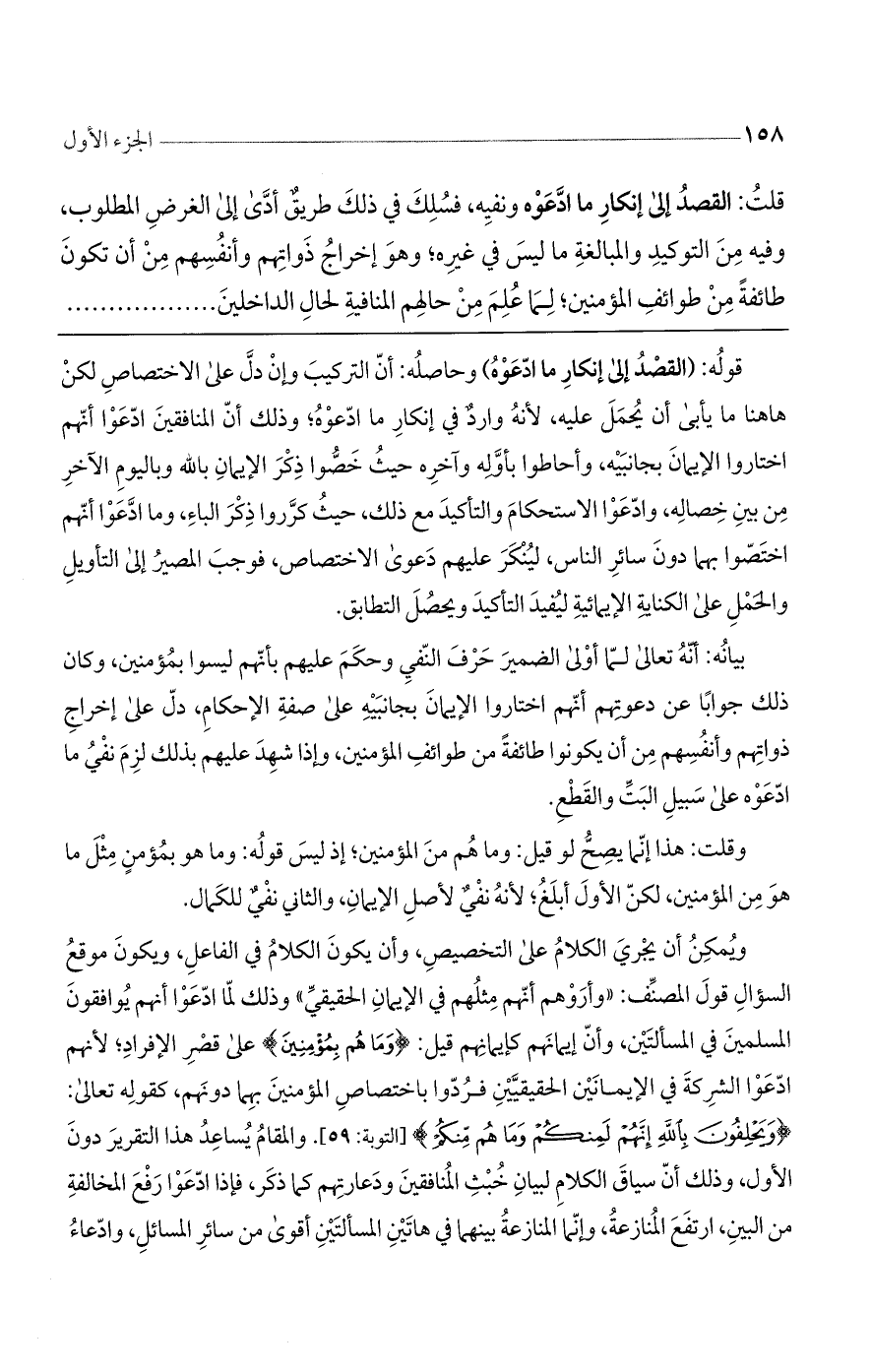ويمكن أن يجري الكلام على التخصيص، وأن يكون الكلام في الفاعل، ويكون موقع السؤال قول المصنف: ((وأروهم أنهم مثلهم في الإيمان الحقيقي)) وذلك لما ادعوا أنهم يوافقون المسلمين في المسألتين، وأن إيمانَهم كإيمانِهم قيل: (وَمَا هُم بِمُؤْمِنِينَ) على قصر الإفراد؛ لأنهم ادعوا الشركة في الإيمانين الحقيقيين فردوا باختصاص المؤمنين بهما دونهم، كقوله تعالى: (ويَحْلِفُونَ بِاللَّهِ إنَّهُمْ لَمِنكُمْ ومَا هُم مِّنكُمْ) [التوبة: 59]. والمقام يساعد هذا التقرير دون الأول، وذلك أن سياق الكلام لبيان خبث المنافقين ودعارتهم كما ذكر، فإذا ادعوا رفع المخالفة من البين، ارتفع المنازعة، وإنما المنازعة بينهما في هاتين المسألتين أقوى من سائر المسائل، وادعاء