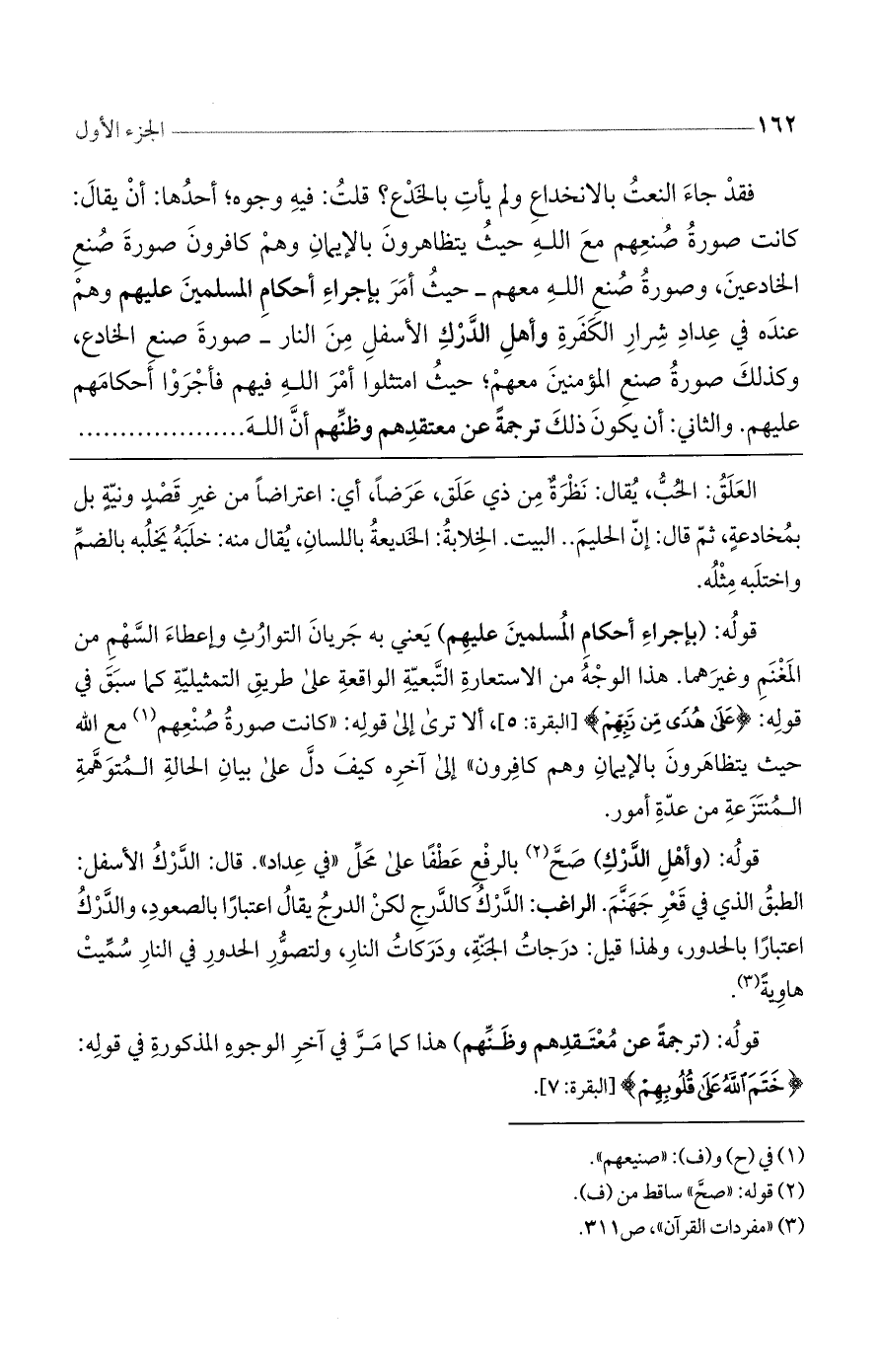 قوله: (بإجراء أحكام المسلمين عليهم) يعني به جريان التوارث وإعطاء السهم من المغنم وغيرهما. هذا الوجه من الاستعارة التبعية الواقعة على طريق التمثيلية كما سبق في قوله: (عَلَى هُدًى مِّن رَّبِّهِمْ) [البقرة: 5]، ألا ترى إلى قوله: ((كانت صورة صنعهم مع الله حيث يتظاهرون بالإيمان وهم كافرون)) إلى آخره كيف دل على بيان الحالة المتوهمة المنتزعة من عدة أمور.