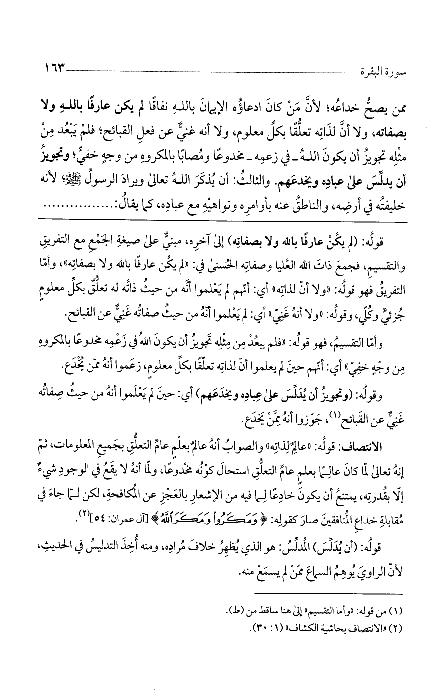 الانتصاف: قوله: ((عالمٌ لذاته)) والصواب أنه عالمٌ بعلمٍ عام التعلق بجميع المعلومات، ثم إنه تعالى لما كان عالماً بعلمٍ عام التعلق استحال كونه مخدوعاً، ولما أنه لا يقع في الوجود شيءٌ إلا بقدرته، يمتنع أن يكون خادعاً لما فيه من الإشعار بالعجز عن المكافحة، لكن لما جاء في مقابلة خداع المنافقين صار كقوله: (ومَكَرُوا ومَكَرَ اللَّهُ) [آل عمران: 54].