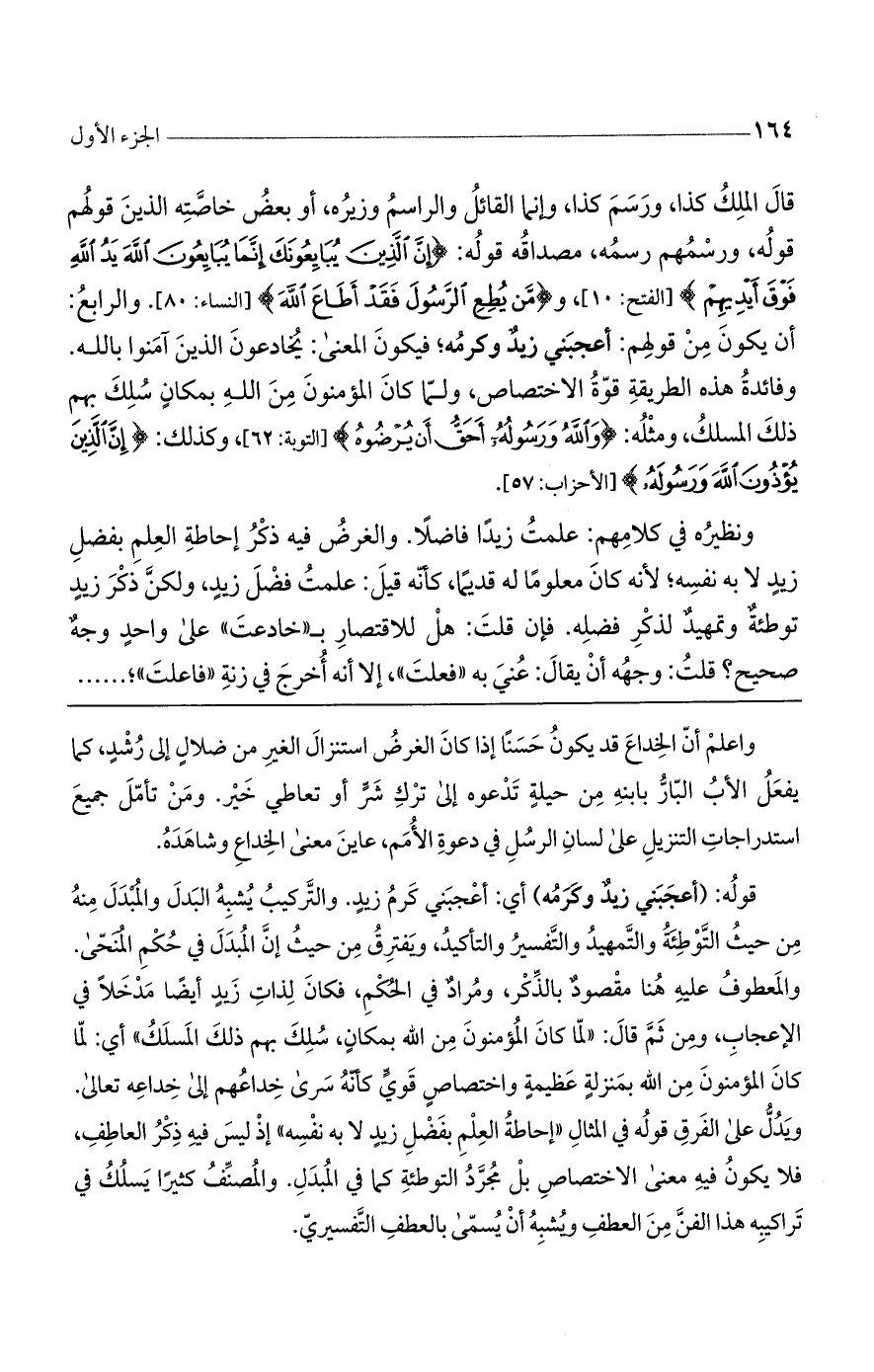 قوله: (أعجبني زيدٌ وكرمه) أي: أعجبني كرم زيدٍ. والتركيب يشبه البدل والمبدل منه من حيث التوظئة والتمهيد والتفسير والتأكيد، ويفترق من حيث إن المبدل في حكم المنحى. والمعطوف عليه هنا مقصودٌ بالذكر، ومرادٌ في الحكم، فكان لذات زيدٍ أيضاً مدخلاً في الإعجاب، ومن ثم قال: ((ولما كان المؤمنون من الله بمكانٍ سلك بهم ذلك المسلك)) أي: لما كان المؤمنون من الله بمنزلةٍ عظيمةٍ واختصاصٍ قويٍّ كأنه سرى خداعهم إلى خداعه تعالى. ويدل على الفرق قوله في المثال ((إحاطة العلم بفضل زيدٍ لا به نفسه)) إذ ليس فيه ذكر العاطف، فلا يكون فيه معنى الاختصاص بل مجرد التوطئة كما في المبدل. والمصنف كثيراً يسلك في تراكيبه هذا الفن من العطف ويشبه أن يسمى بالعطف التفسيري.