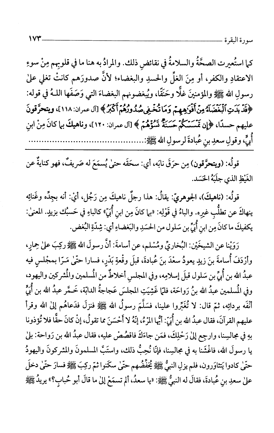 قوله: (ناهيك)، الجوهري: يقال: هذا رجلٌ ناهيك من رجل، أي: أنه بجده وغنائه ينهاك عن تطلب غيره. والباء في قوله: ((بما كان من ابن أبيٍّ)) كالباء في حسبك بزيدٍ. المعنى: يكفيك ما كان من ابن أبي بن سلول من الحسد والبغضاء أي: شدة البغض.
