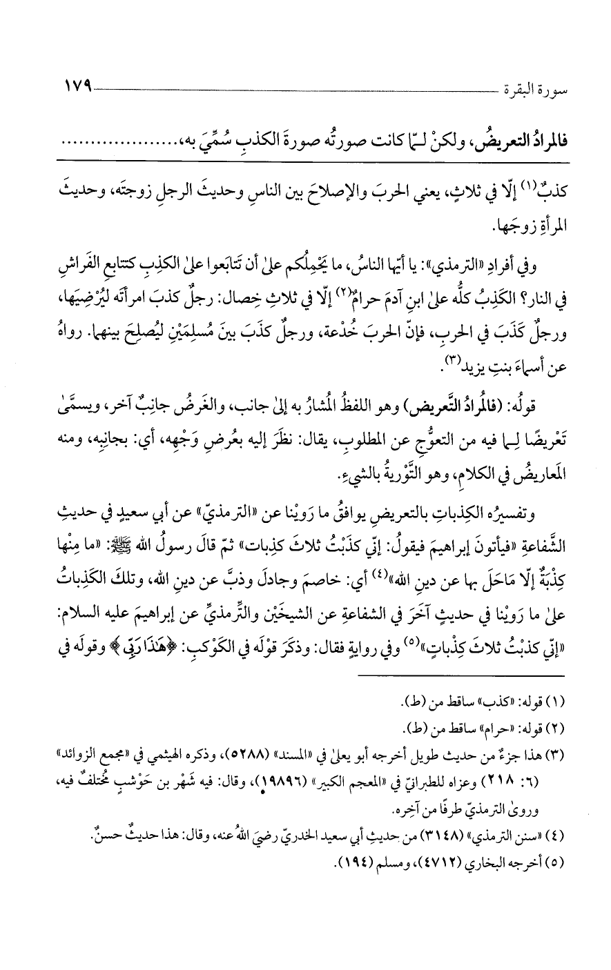 وتفسيره الكذبات بالتعريض يوافق ما روينا عن ((الترمذي)) عن أبي سعيدٍ في حديث الشفاعة ((فيأتون إبراهيم فيقول: إني كذبت ثلاث كذبات)) ثم قال رسول الله صلى الله عليه وسلم: ((ما منها كذبةٌ إلا ما حل بها عن دين الله)) أي: خاصم وجادل وذب عن دين الله، وتلك الكذبات على ما روينا في حديثٍ آخر في الشفاعة عن الشيخين والترمذي عن إبراهيم عليه السلام: ((إني كذبت ثلاث كذبات)) وفي روايةٍ فقال: وذكر قوله في الكوكب: (هَذَا رَبِّي) وقوله في