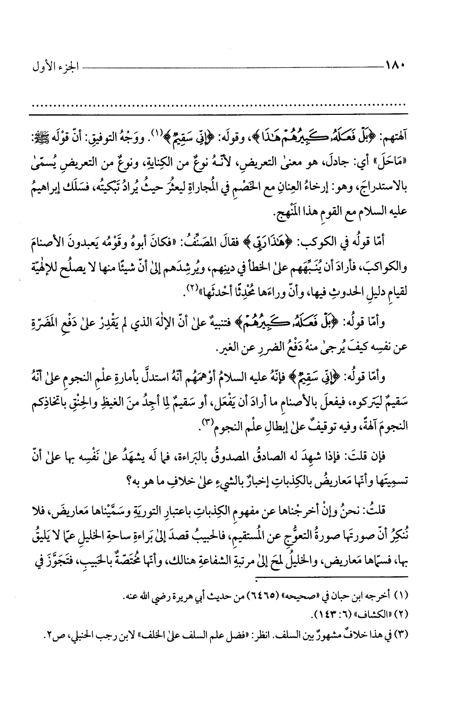 آلهتهم: (بَلْ فَعَلَهُ كَبِيرُهُمْ هَذَا)، وقوله: (إنِّي سَقِيمٌ). ووجه التوفيق: أن قوله صلى الله عليه وسلم: ((ما حل)) أي: جادل، وهو معنى التعريض، لأنه نوعٌ من الكناية، ونوعٌ من التعريض يسمى بالاستدراج، وهو: إرخاء العنان مع الخصم في المجاراة ليعثر حيث يراد تبكيته، فسلك إبراهيم عليه السلام مع القوم هذا المنهج.