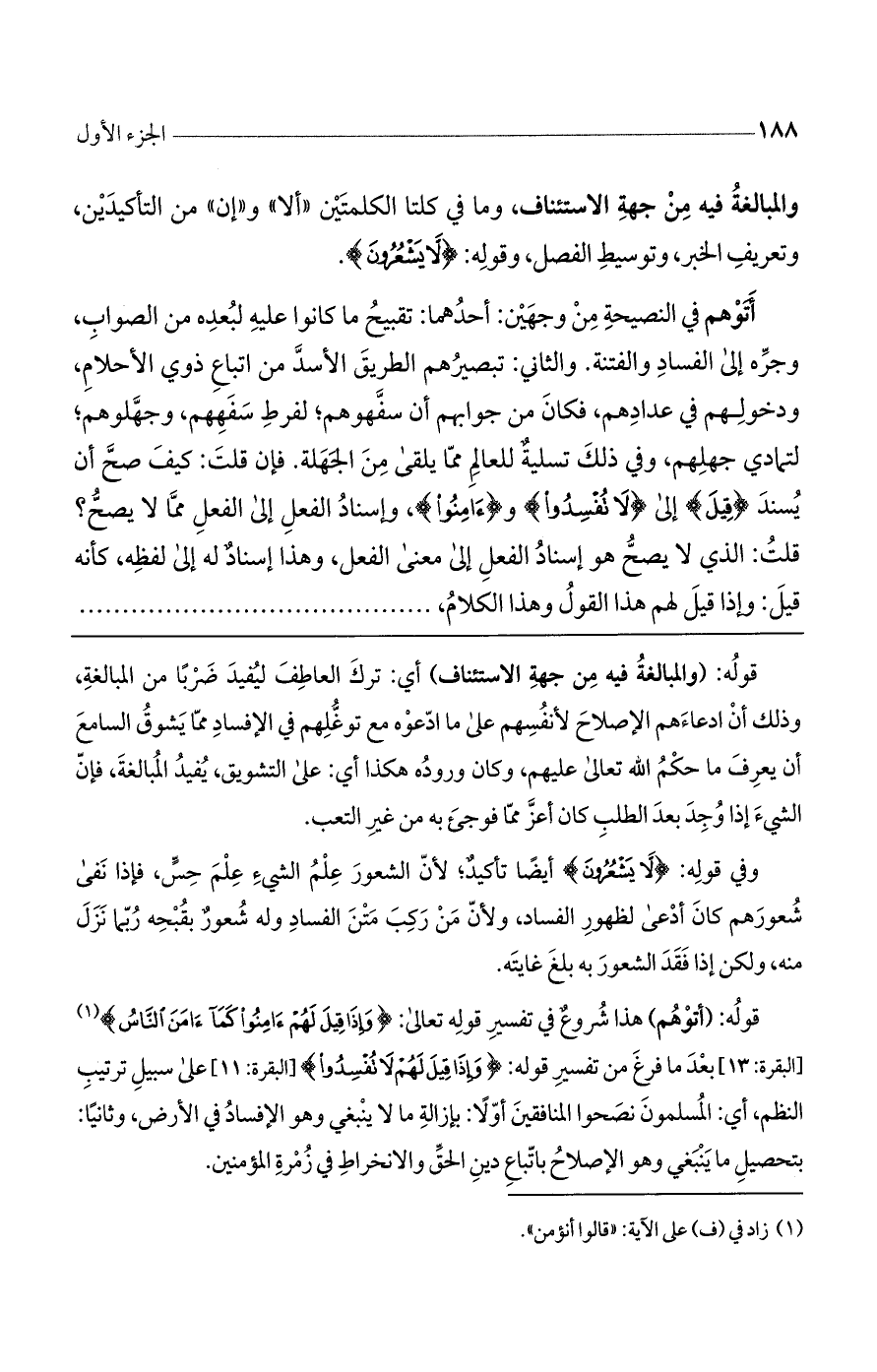 قوله: (والمبالغة فيه من جهة الاستئناف) أي: ترك العاطف ليفيد ضرباً من المبالغة، وذلك أن ادعاءهم الإصلاح لأنفسهم على ما ادعوه مع توغلهم في الإفساد مما يشوق السامع أن يعرف ما حكم الله تعالى عليهم، وكان وروده هكذا أي: على التشويق، يفيد المبالغة، فإن الشيء إذا وجد بعد الطلب كان أعز مما فوجئ به من غير التعب.