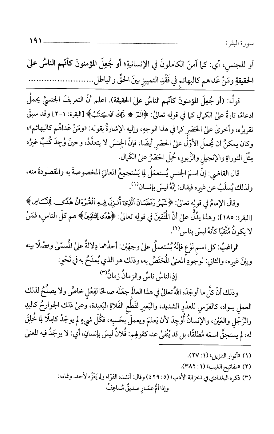 قوله: (أو جعل المؤمنون كأنهم الناس على الحقيقة). اعلم أن التعريف الجنسي يحمل ادعاءً، تارةً على الكمال كما في قوله تعالى: (الم* ذَلِكَ الكِتَابُ) [البقرة: 1 - 2] وقد سبق تقريره، وأخرى على الحصر كما في هذا الوجه، وإليه الإشارة بقوله: ((ومن عداهم كالبهائم))، وكان يمكن أن يحمل الأول على الحصر أيضاً، فإن الجنس لا يتعدد، وحين وجد كتبٌ غيره مثل التوراة والإنجيل والزبور، حمل الحصر على الكمال.